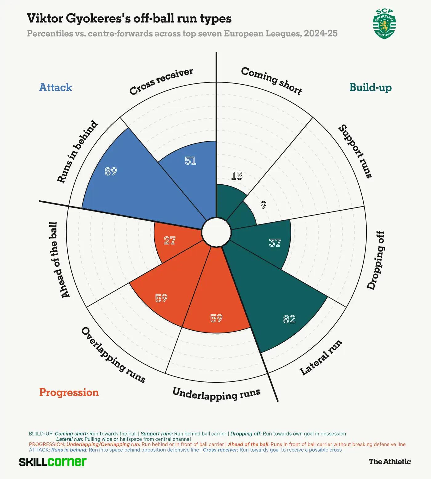Как видно из его профиля передвижений SkillCorner — сравнивающего его работу без мяча с нападающими из топ-7 европейских лиг — он часто открывается за спину защитников или уходит на фланг, чтобы растянуть оборону, затем смещается внутрь и мощно завершает атаку.