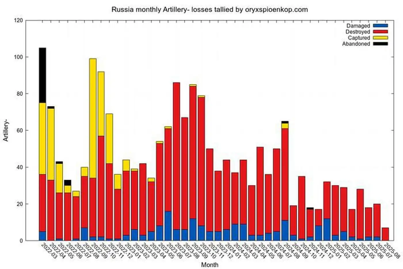 OSINT-исследователь Cyrus отмечает продолжение снижения потерь российской бронетехники за август — и без того рекордно низкого за лето 2025; то же самое касается и артиллерии.