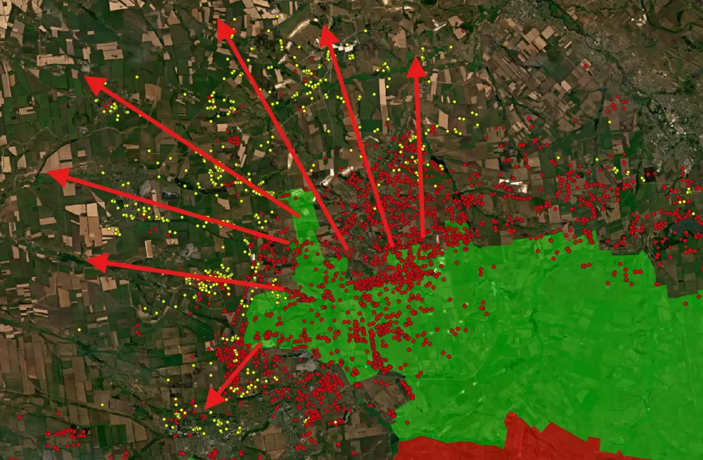 Как всегда, это указывает, где российская армия планирует продвигаться в ближайшие недели и месяцы, потому что сначала они разрушают украинские позиции, а затем проводят штурмы.