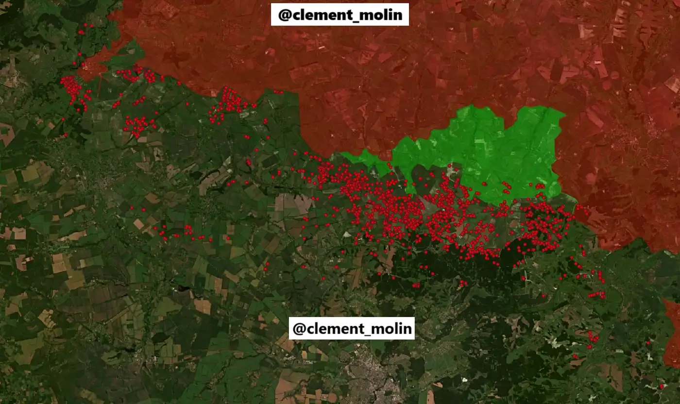Здесь Clément Molin зафиксировал более 2800 (!) авиаударов. Около 85% из них – в лесополосах, селах и лесах к северу от Сум. То есть это интенсивная массированная кампания.