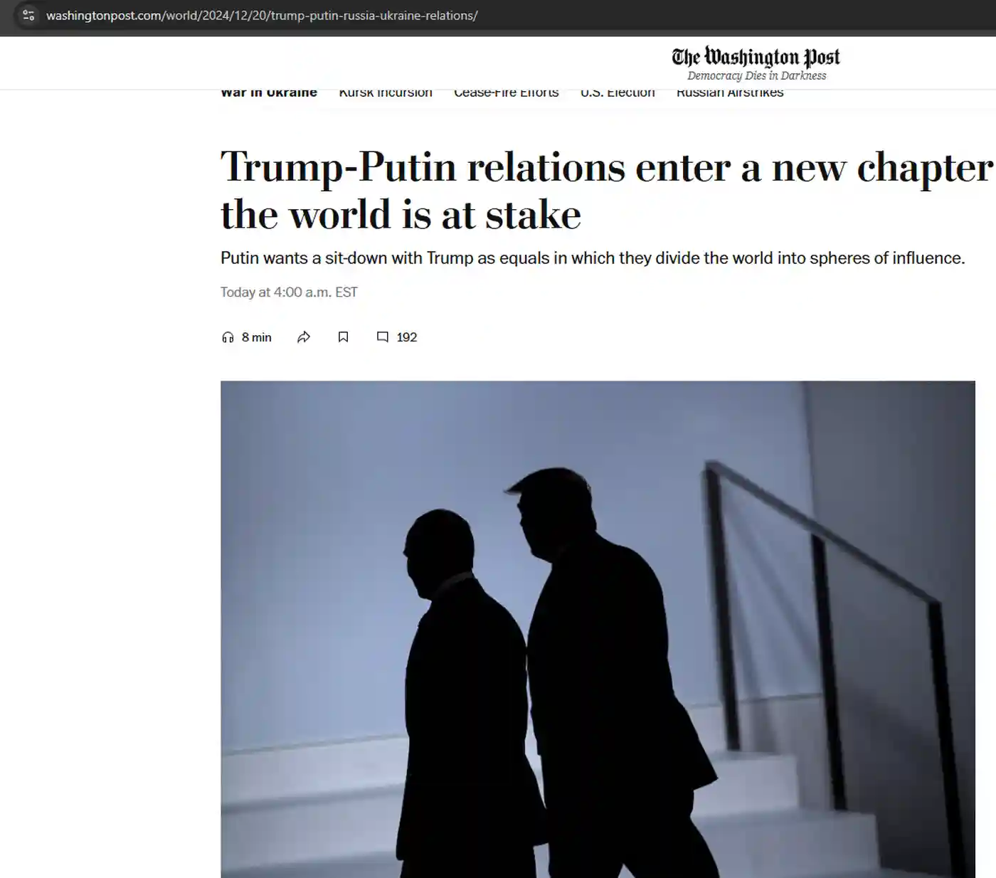 WP сегодня написала, что Трамп и Путин готовят встречу, на которой Путин хочет предложить Трампу (раз уж Трамп так хочет сделку по Украине) в обмен на сделку по Украине разделить сферы влияния в мире.