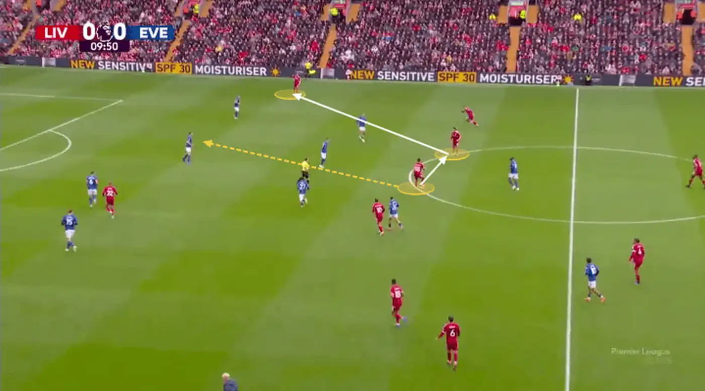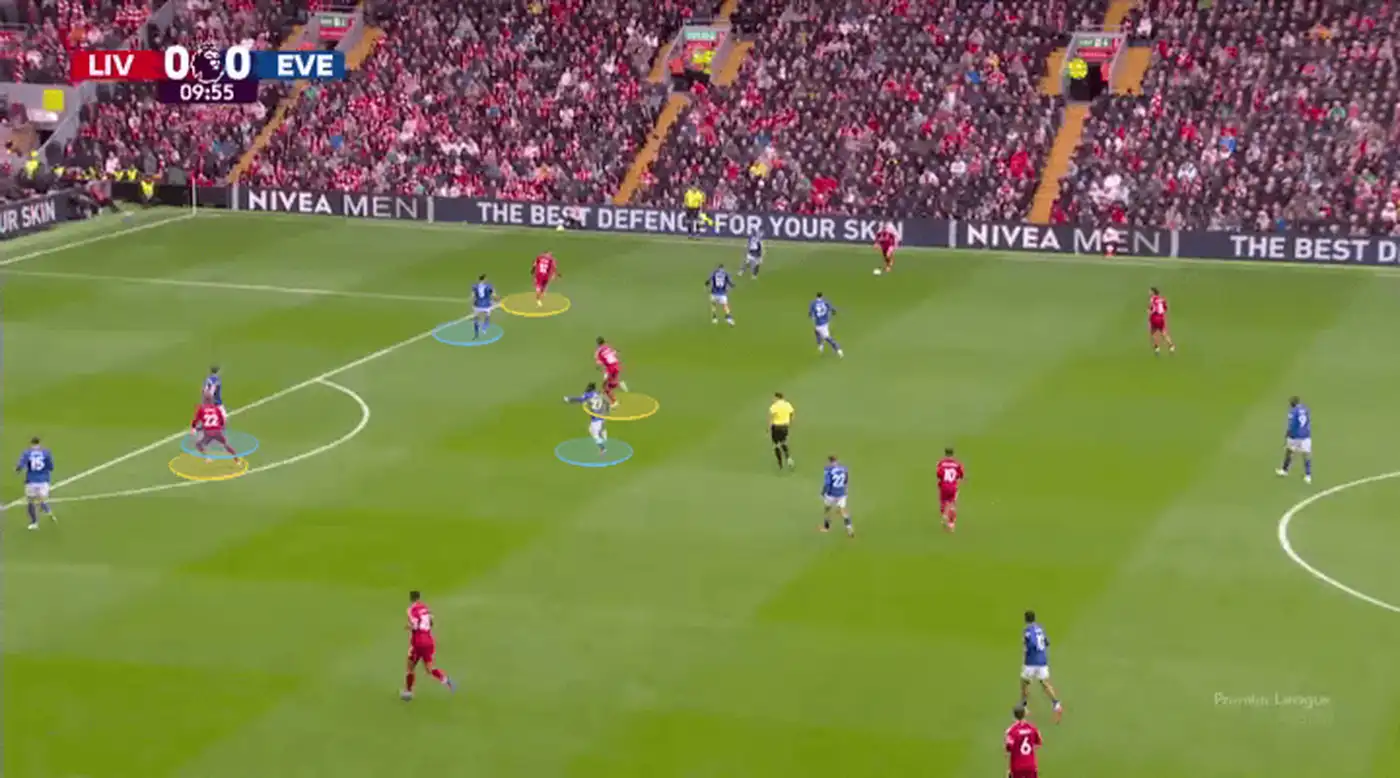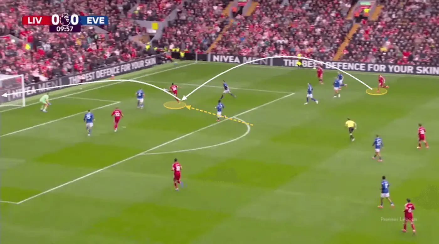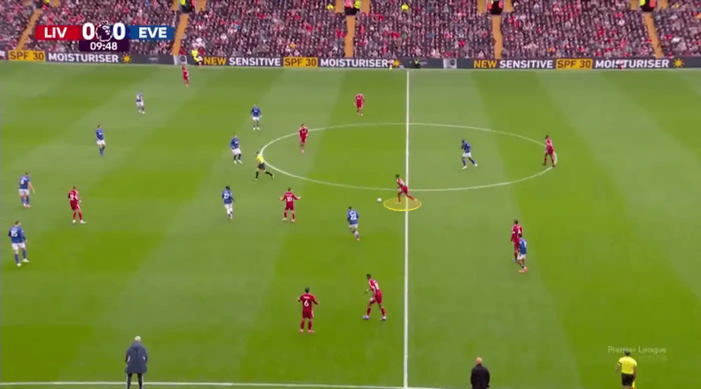 «Эвертон» не понимает, как остановить этот рывок Гравенберха. Полузащитник Идрисса Гейе показывает жестом своим центральным защитникам взять его под опеку, но те заняты наблюдением за другими игроками «Ливерпуля».