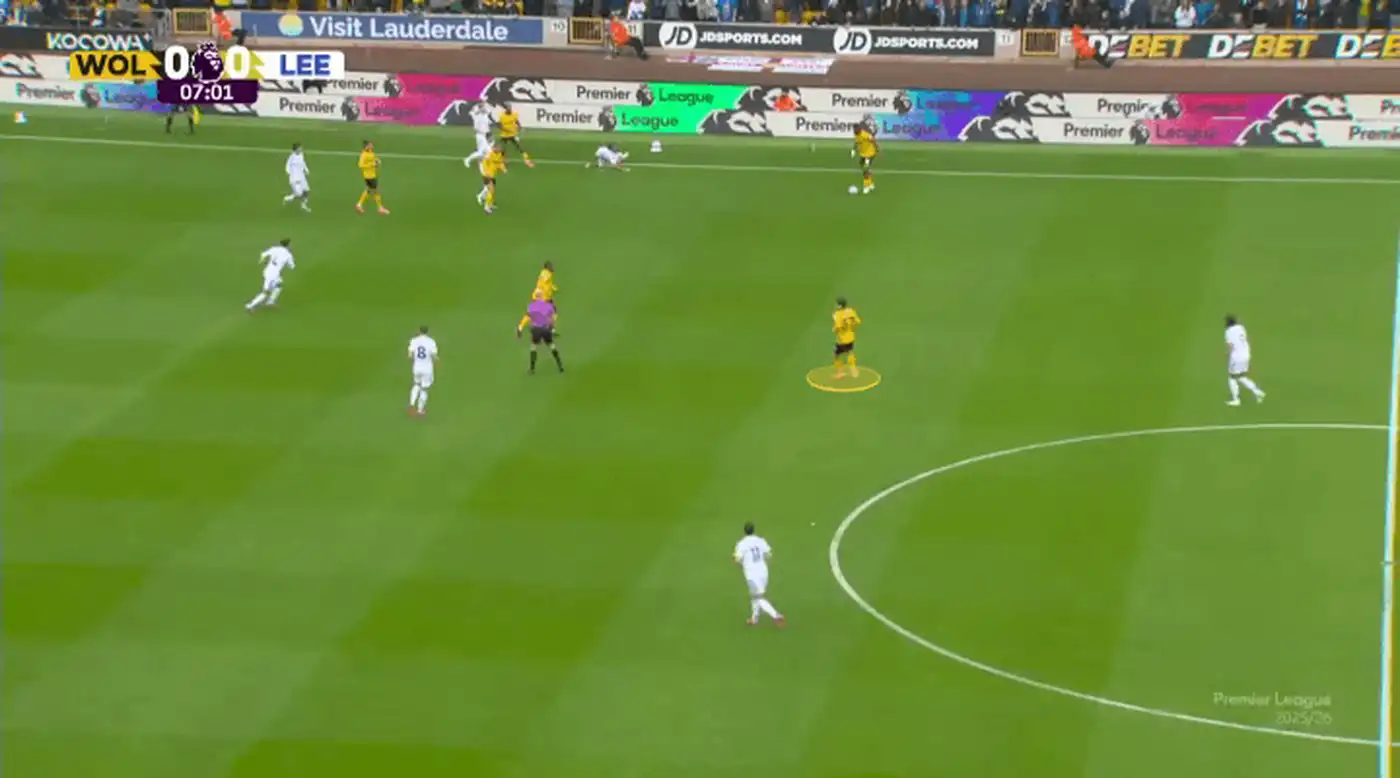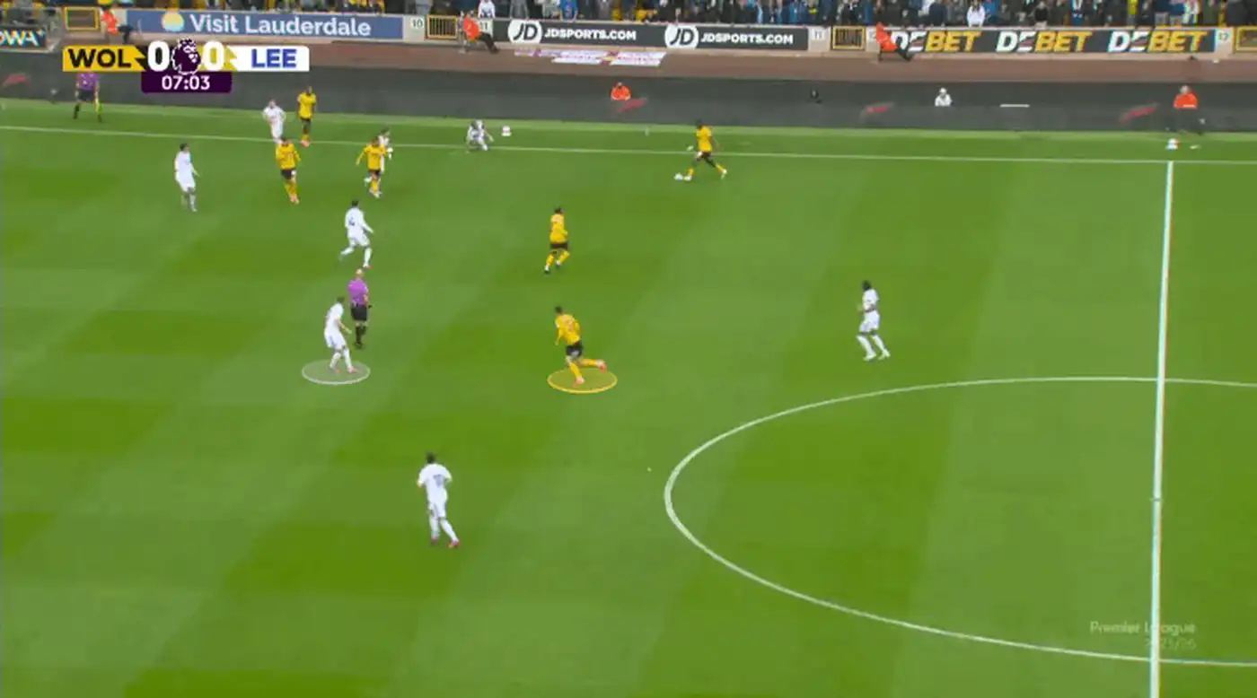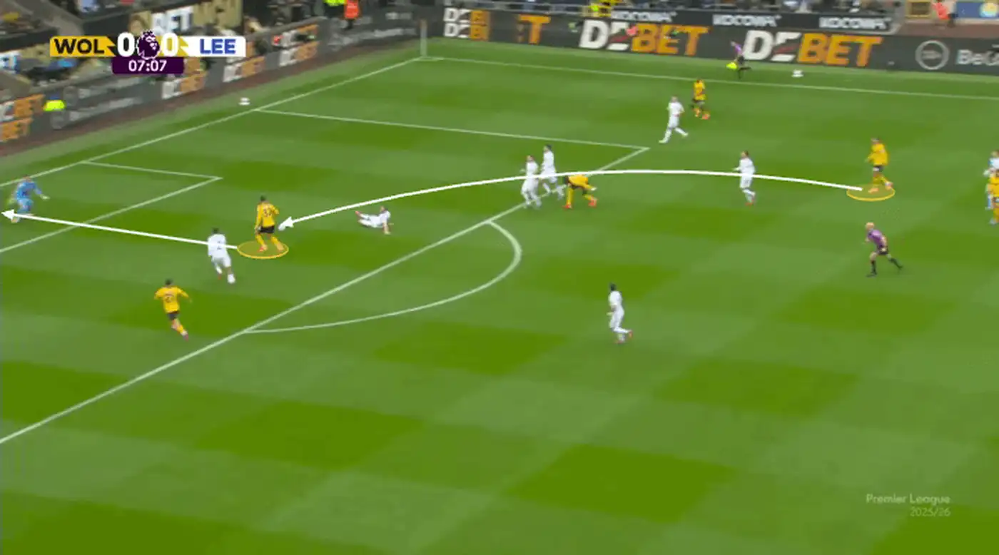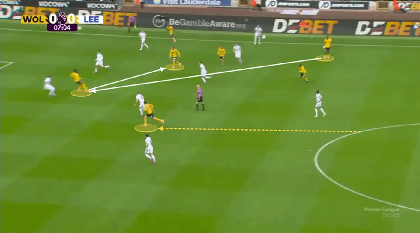Это отличная розыгрышная комбинация — Эммануэль Агбаду отдаёт мяч нападающему Толу Арокодаре, который опускается глубже, а затем следует пас на плеймейкера Фера Лопеса…