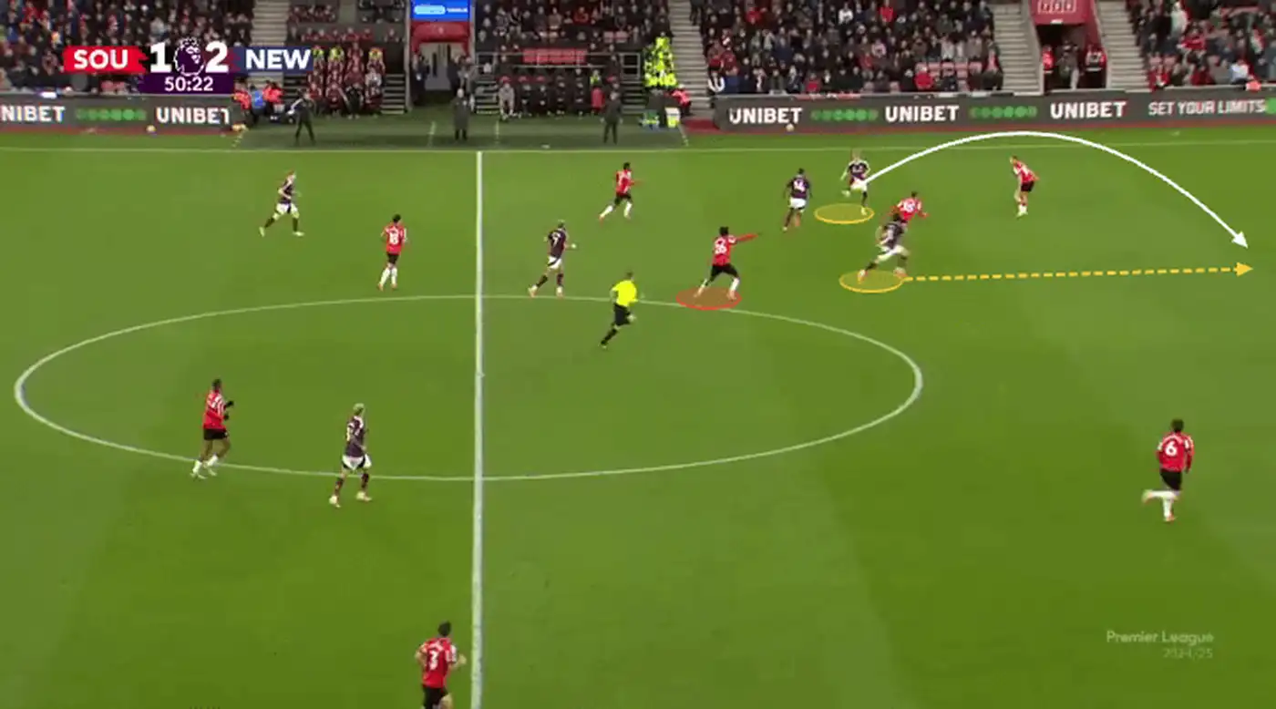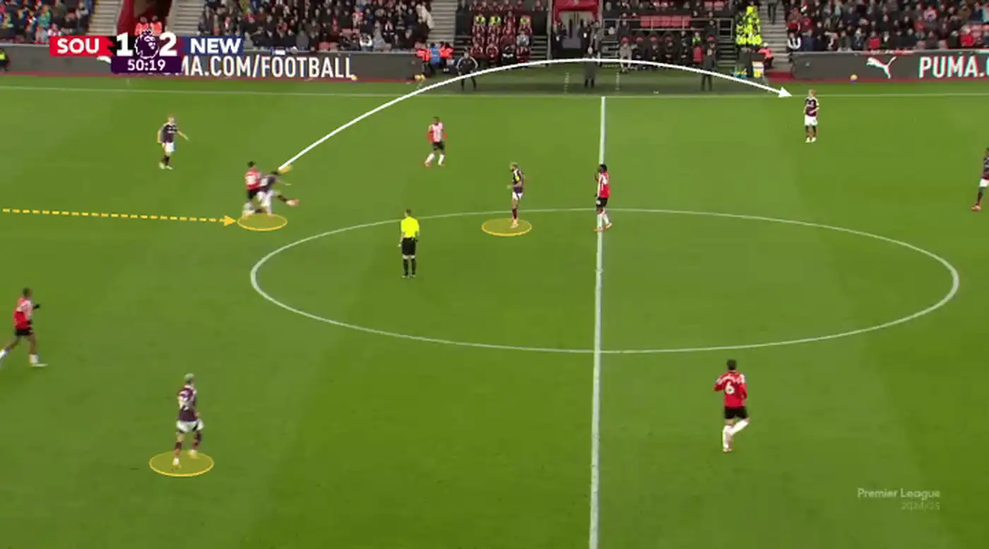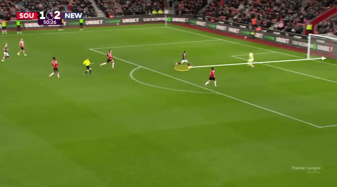 Ещё один гол, который вспоминается, — это мяч Сандро Тонали за «Ньюкасл» в матче против «Саутгемптона» в прошлом сезоне. Этот эпизод особенно показателен из-за того, как команда Эдди Хау постоянно меняет местами трёх своих полузащитников.