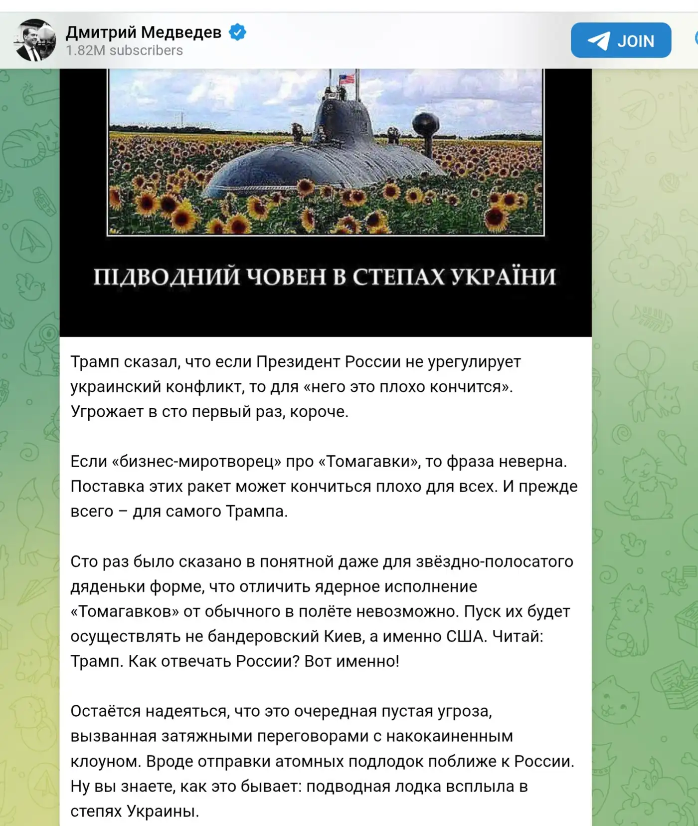«Трамп сказал, что если Президент России не урегулирует украинский конфликт, то для «него это плохо кончится». Угрожает в сто первый раз, короче.