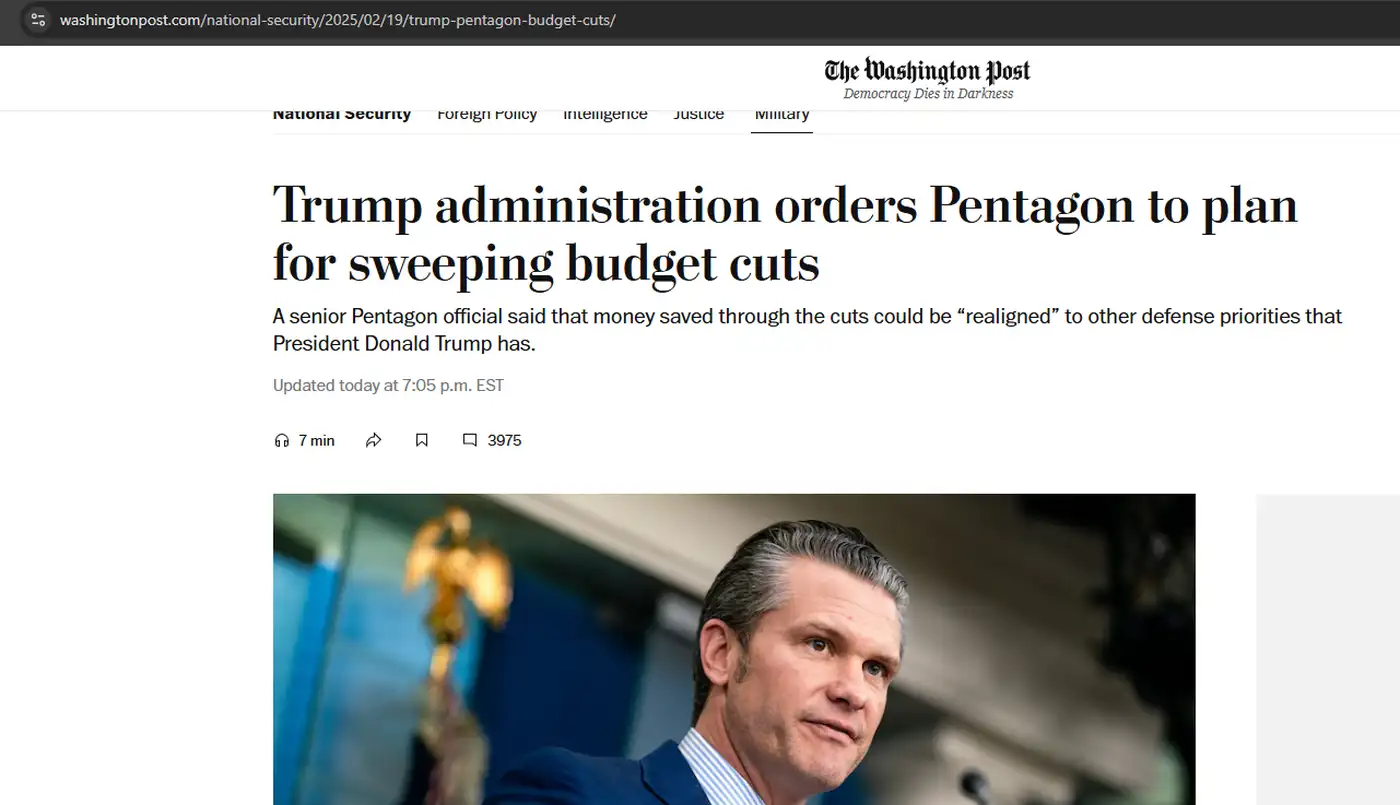 Администрация Трампа приказала Пентагону сокращать расходы на оборону на 8% в каждый из пяти последующих лет, чиновники получили директиву от Пита Хегсета, — The Washington Post.
