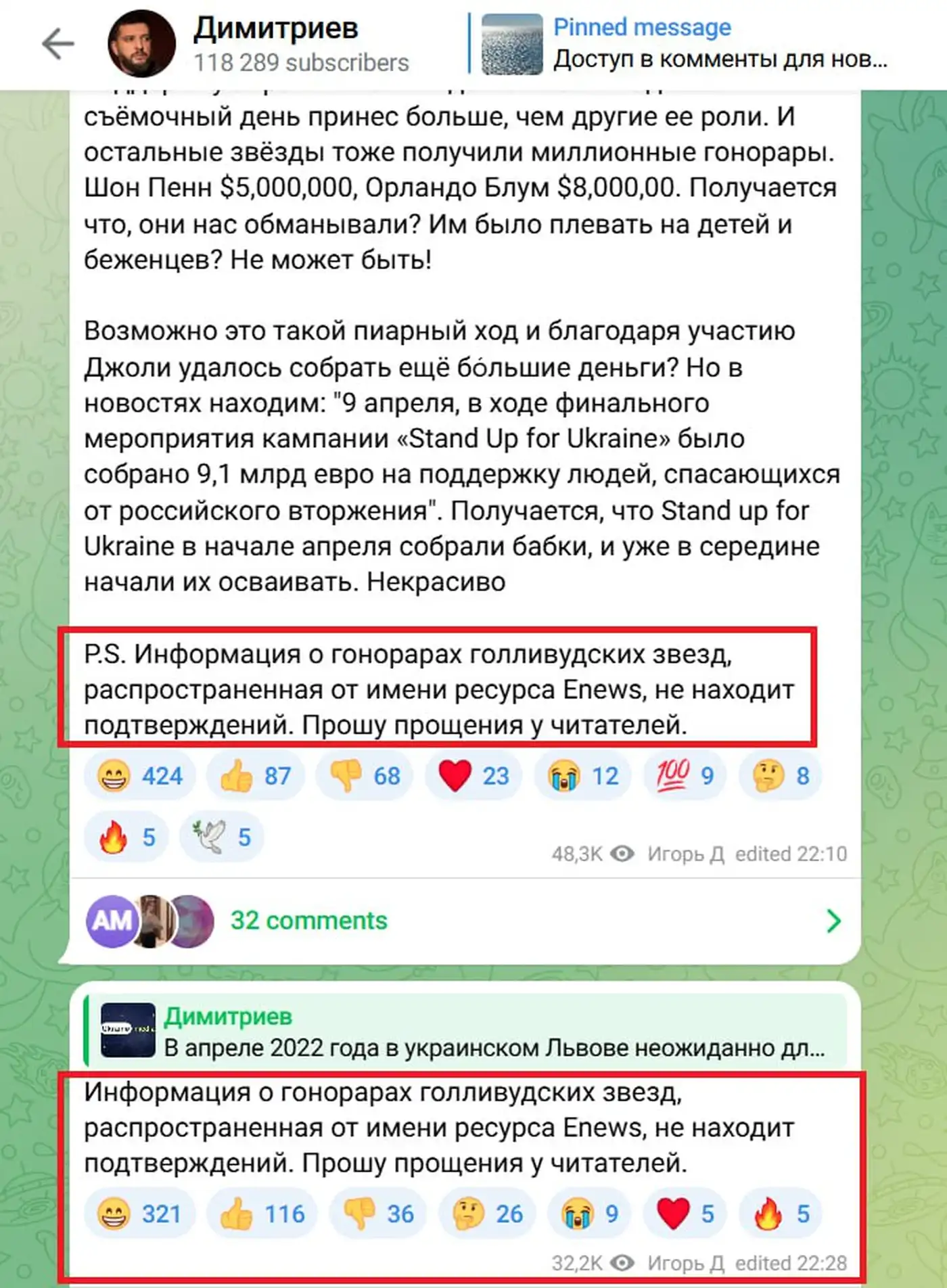 Интернет-сообщество достаточно быстро разоблачило фейк, который репостнули Илон Маск и Дональд Трамп-младший, о том, что Анджелина Джоли, Шон Пенн, Жан-Колд ван Дамм, Орландо Блум и Бен Стиллер якобы получали вознаграждение от USAID в размере от $4 до $20 миллионов долларов за свои поездки в Украину (скрин 1).