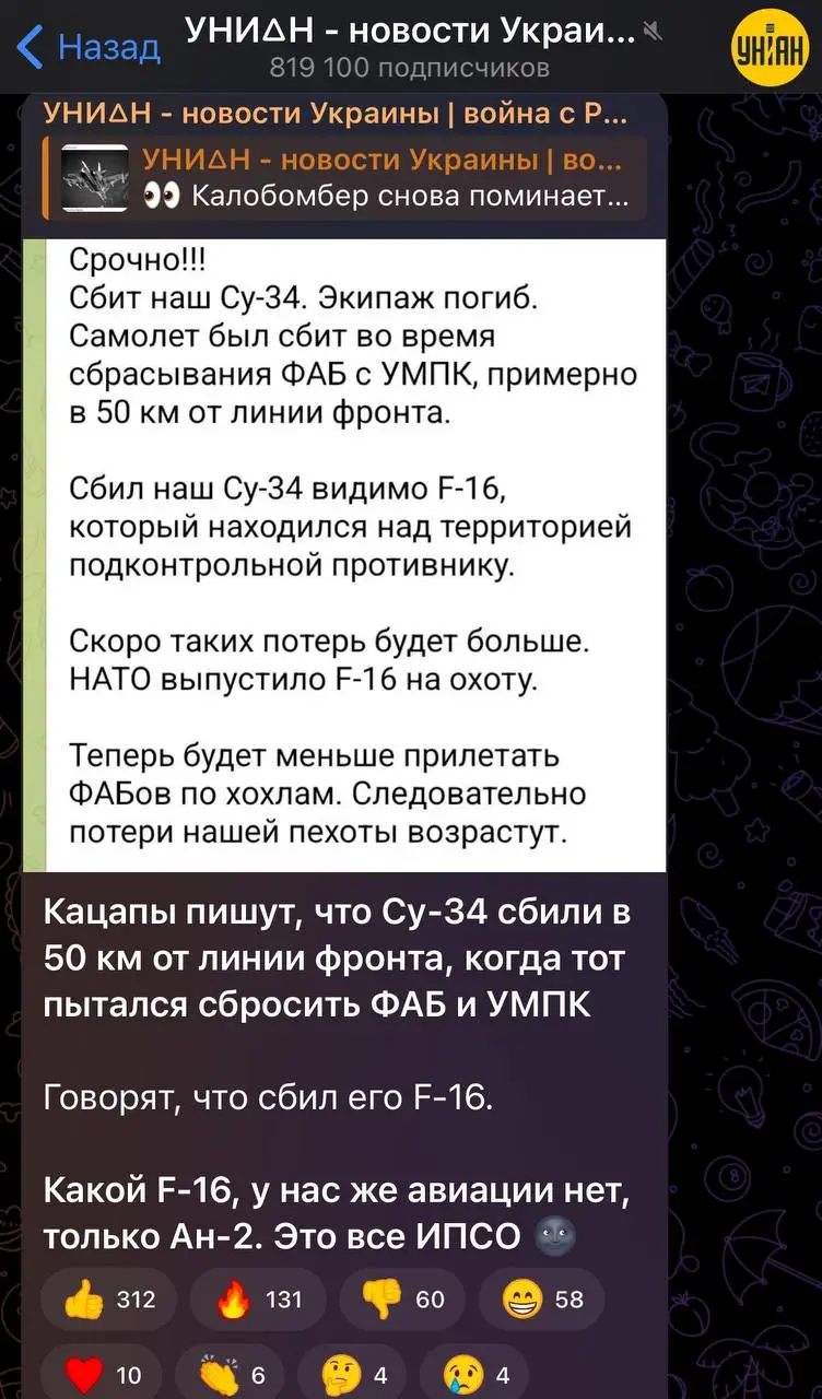 Сама информация о том, что Россия потеряла Су-34 вместе с экипажем – это факт. Ее заявили абсолютно все z-каналы про авиацию (забавно, что fighterbomber перестал писать «вечного полета», потому что это уже стало мемом).