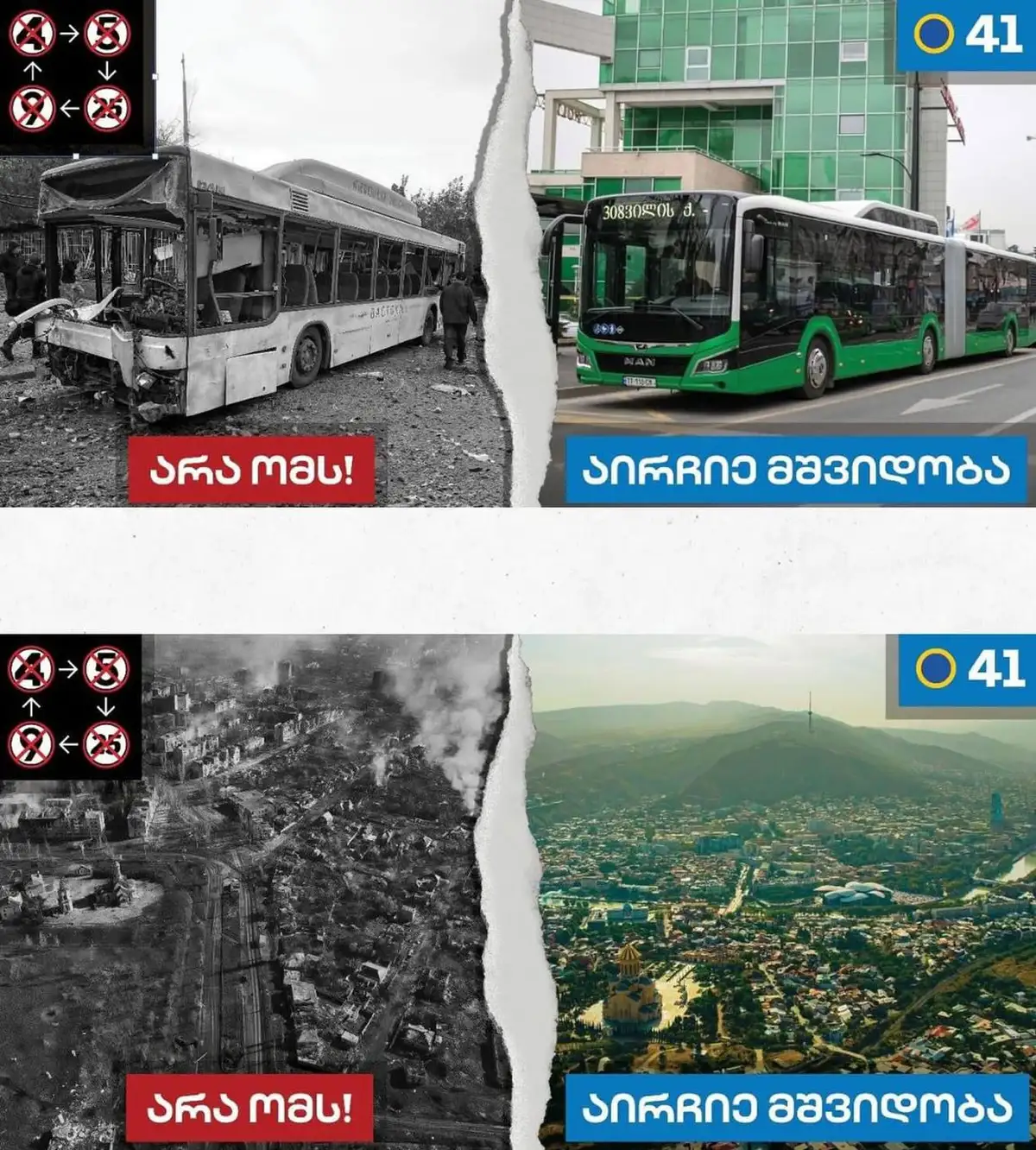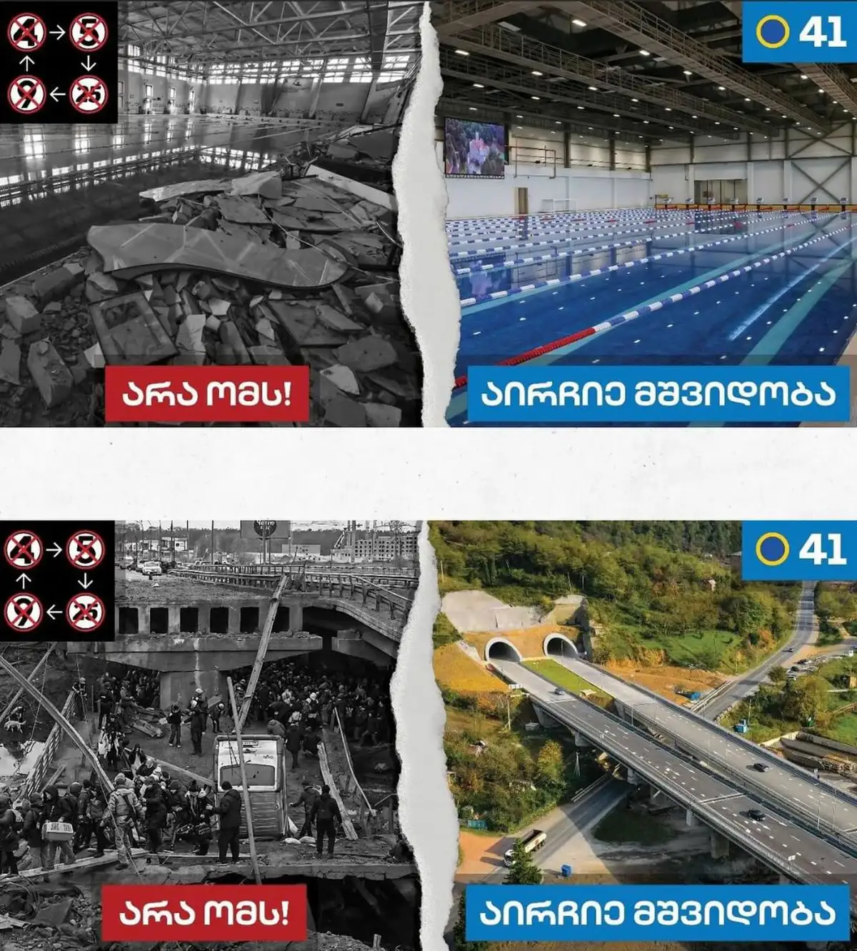 Правящая партия Грузии «Грузинская мечта» в рамках предвыборной агитации изготовила баннеры, где рядом размещены фото нанесенных Россией разрушений в Украине и, на контрасте – «нормальная жизнь» в Грузии.