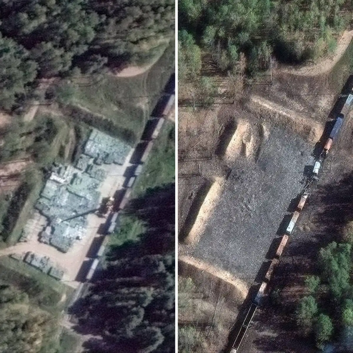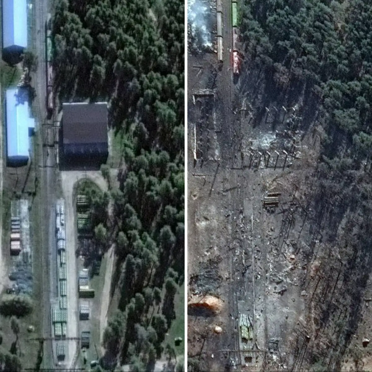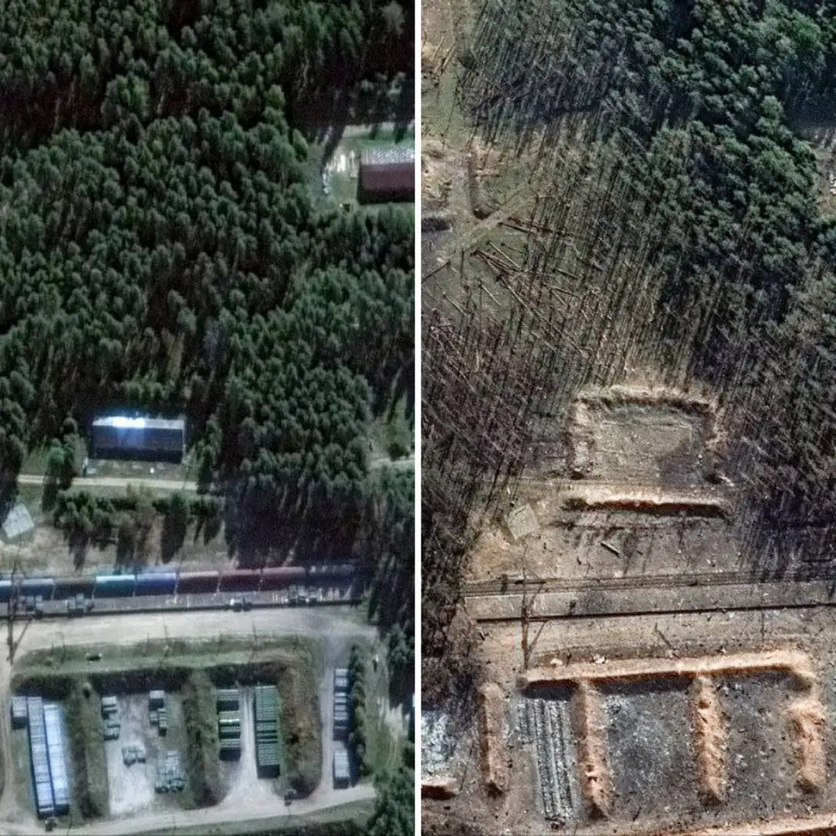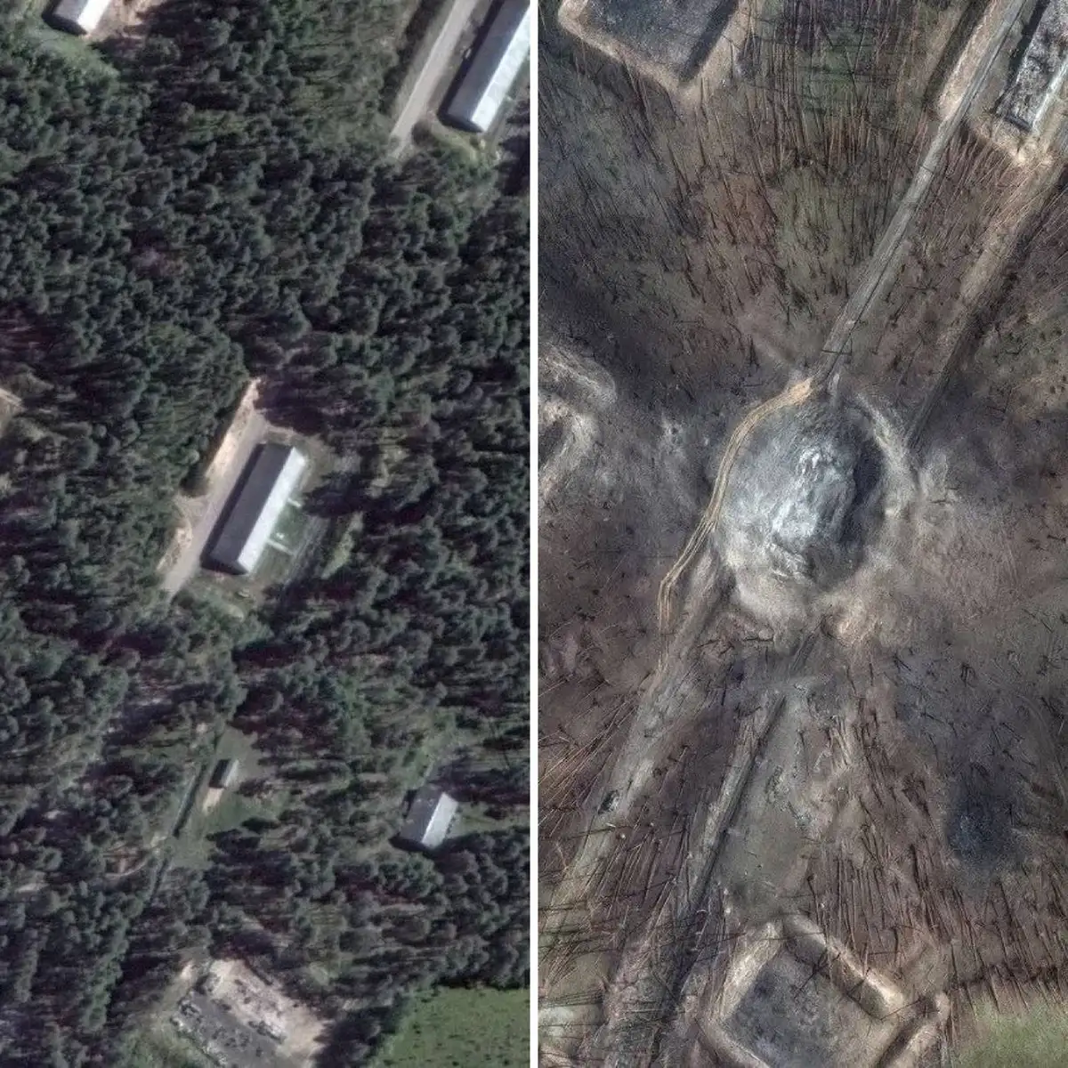 На спутниковых снимках можно увидеть последствия ударов по складам ГРАУ МО России. Эти снимки – «до» и «после» – ясно показывают, как тщательно складировали боеприпасы, а теперь на их месте – только обломки. Местность буквально выжжена, здания разрушены, а остатки взрывов словно лунные кратеры на земле.