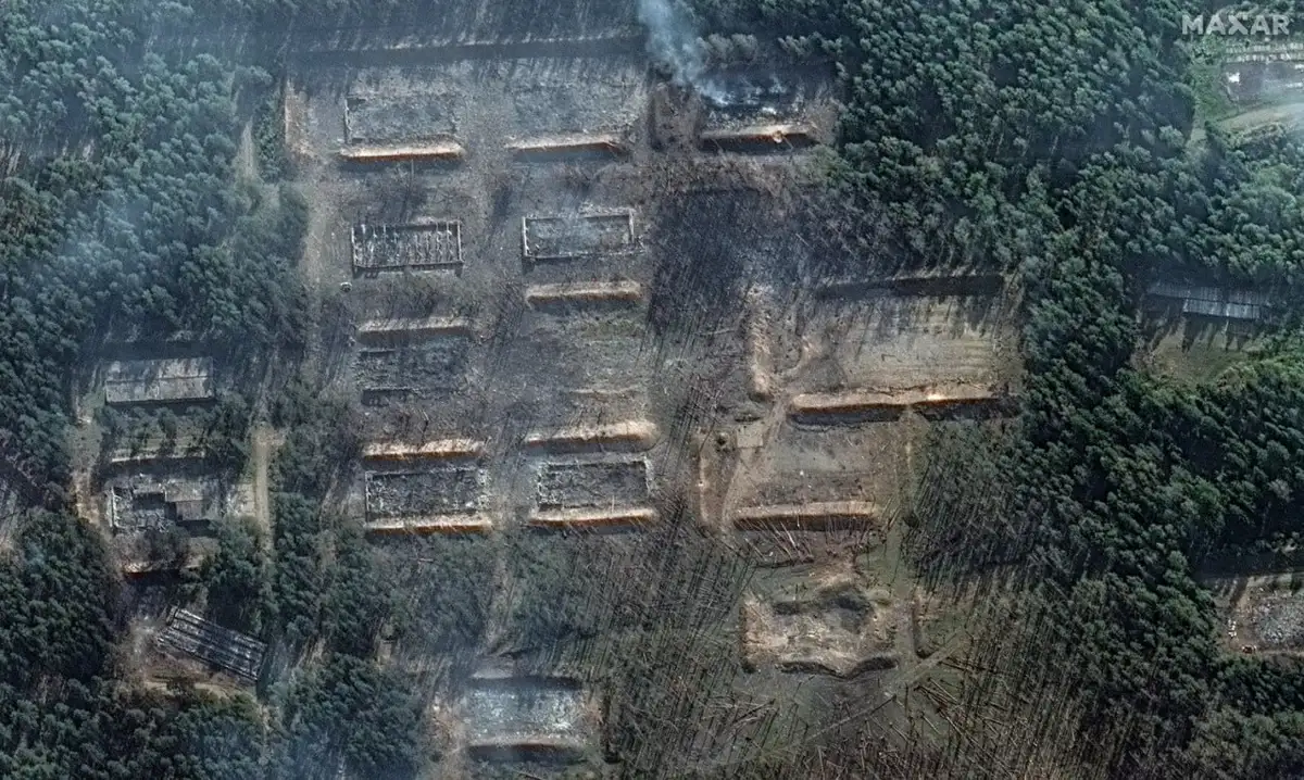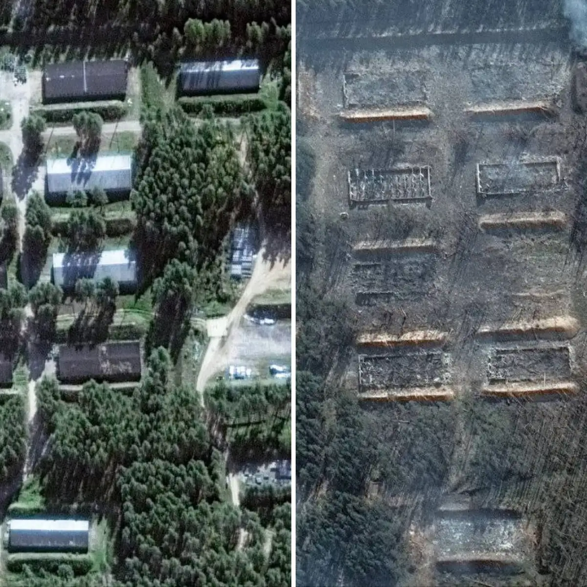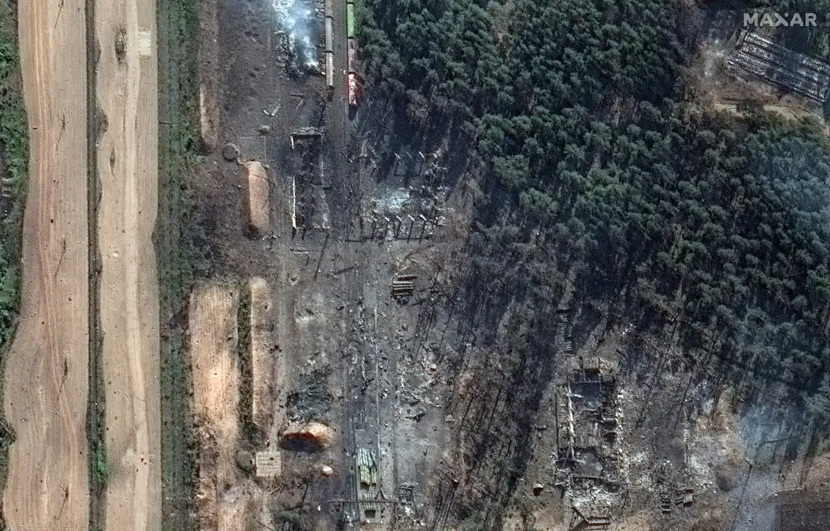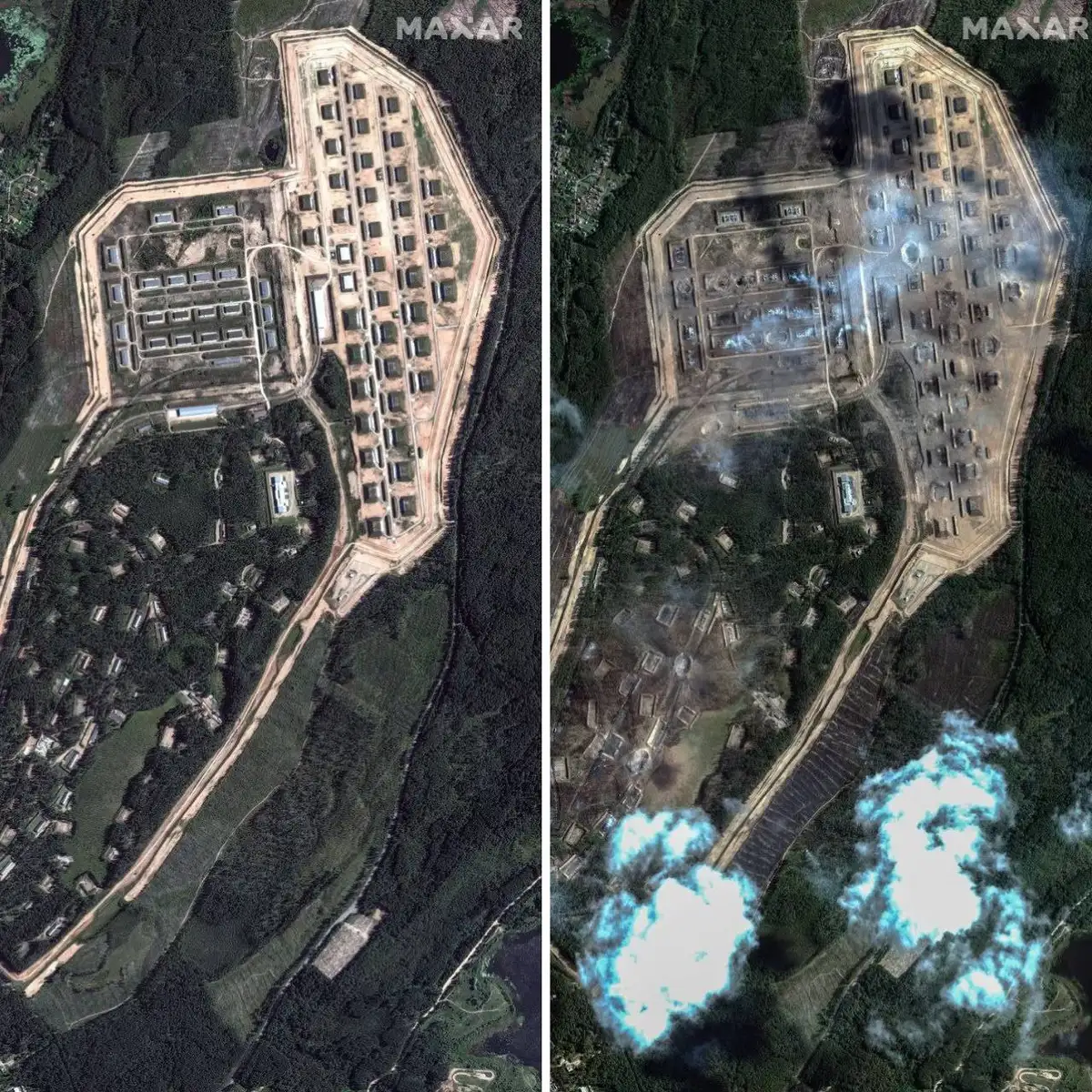 На спутниковых снимках можно увидеть последствия ударов по складам ГРАУ МО России. Эти снимки – «до» и «после» – ясно показывают, как тщательно складировали боеприпасы, а теперь на их месте – только обломки. Местность буквально выжжена, здания разрушены, а остатки взрывов словно лунные кратеры на земле.