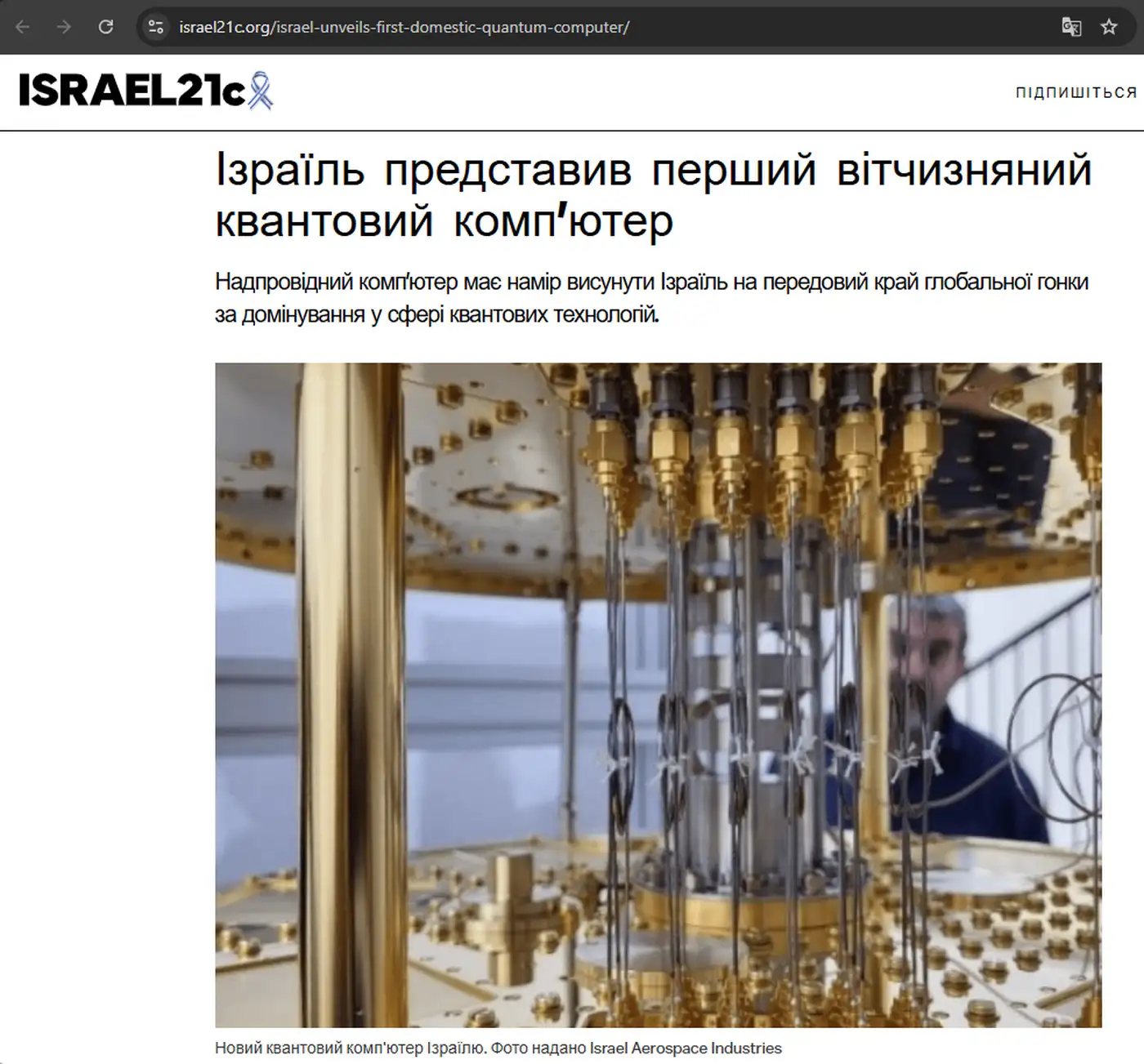 Израиль сделал значительный шаг вперёд в высокотехнологичном противостоянии мировых держав, представив свой первый квантовый компьютер. Об этом сообщает портал Newsru.co.il, который 17 декабря 2024 года опубликовал новость о том, что израильские учёные и инженеры создали 20-кубитный квантовый компьютер на основе сверхпроводящей технологии. Это достижение знаменует выход страны в элиту мирового квантового противостояния – так называемой гонки за «квантовое превосходство».