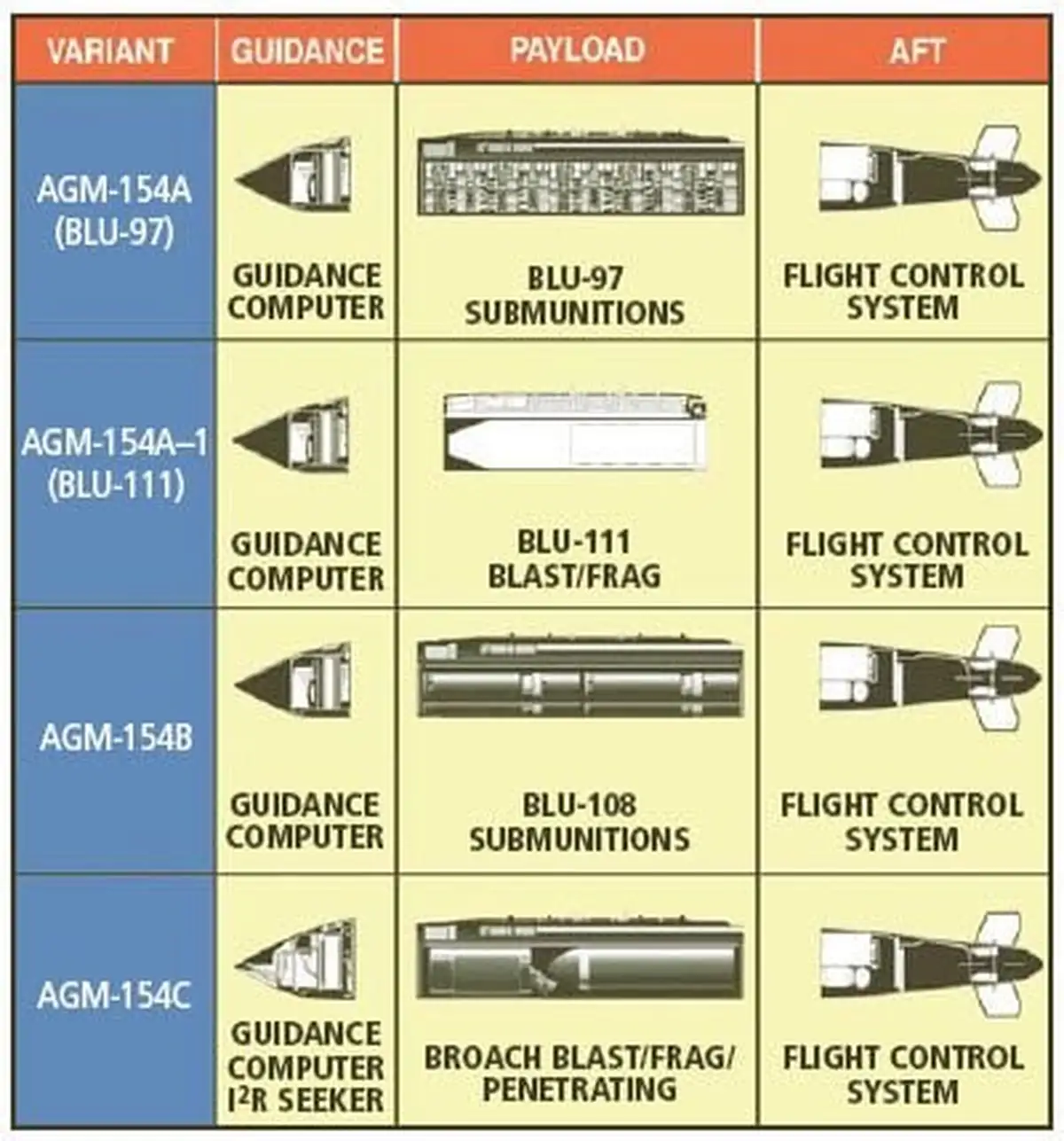 - JSOW-A: Первая версия ракеты, оснащенная кассетной боевой частью BLU-97, предназначенной для поражения широкого спектра целей, включая легкобронированную технику и живую силу противника. Основное применение — подавление врага на поле боя.