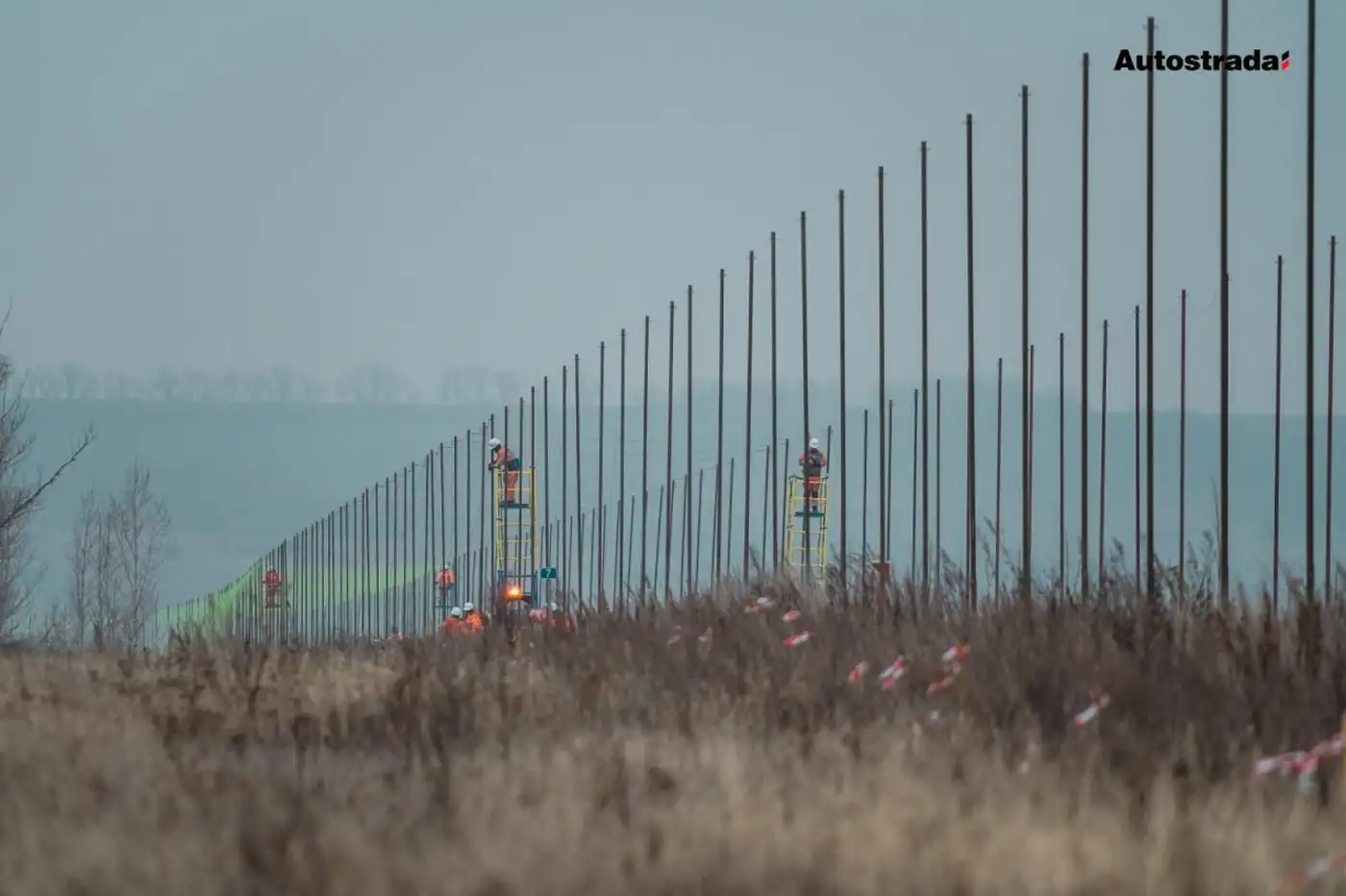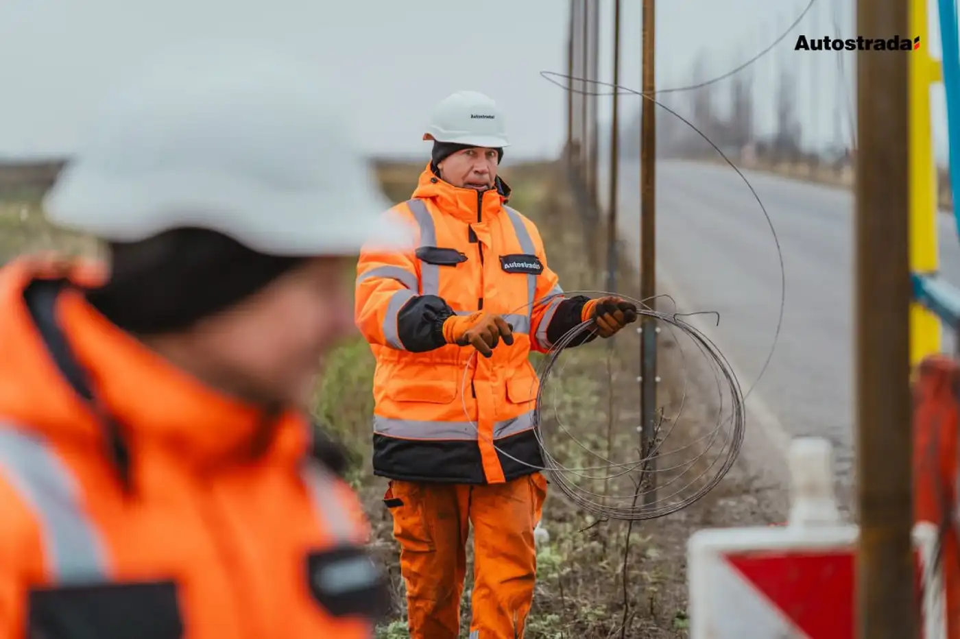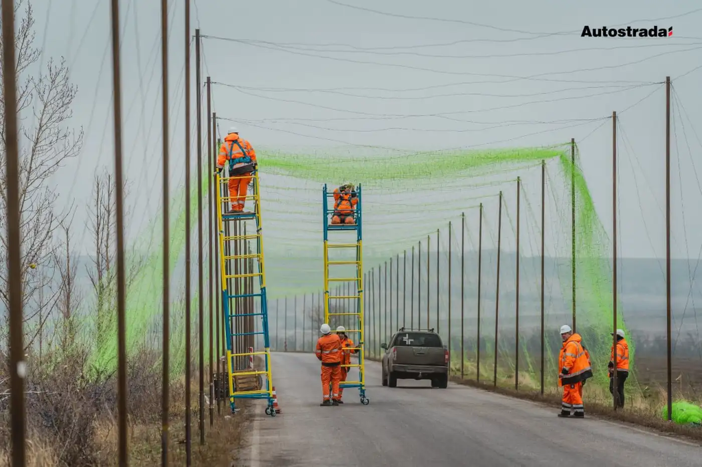Натягивание антидроновых сеток рабочими украинской компании Autostrada.