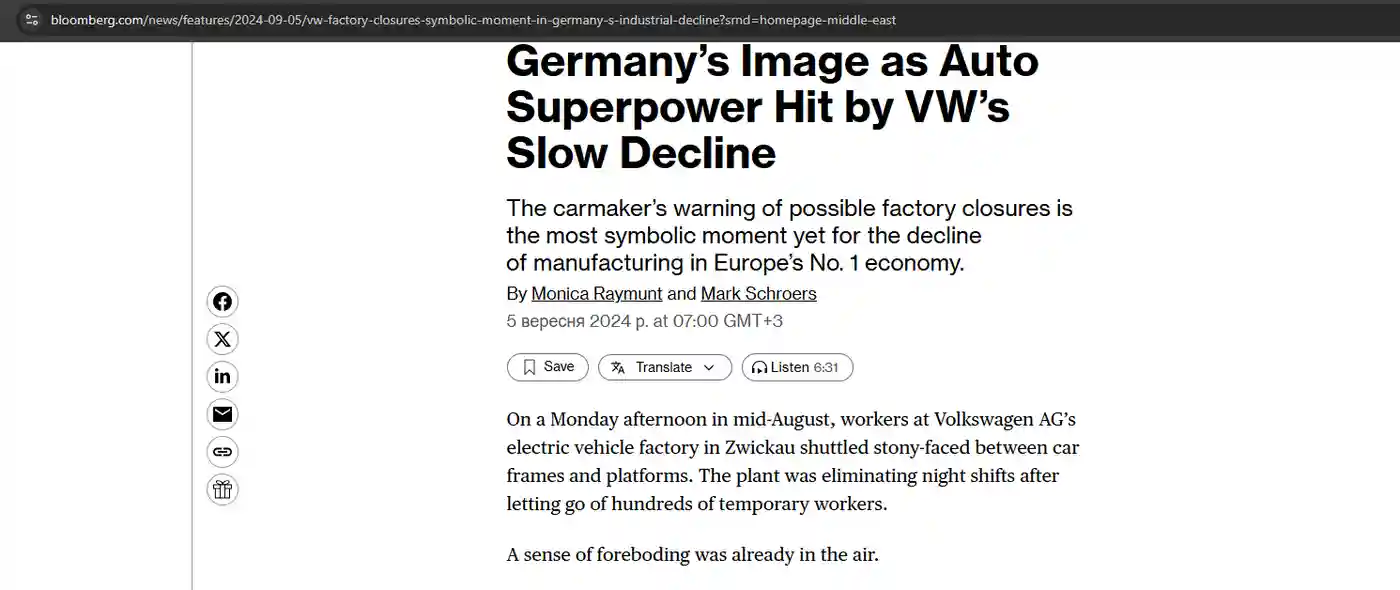 В сентябре 2024 года компания Volkswagen AG, один из крупнейших автопроизводителей Германии, объявила о планах закрытия нескольких заводов на территории страны. Это решение стало символом нарастающего промышленного спада в Германии, которая долгое время считалась оплотом автомобильной индустрии.