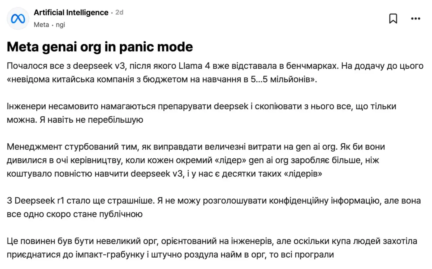 - DeepSeek R1 обогнал в бенчмарках будущий LLaMa 4 от Meta (которая даже не успела выйти).