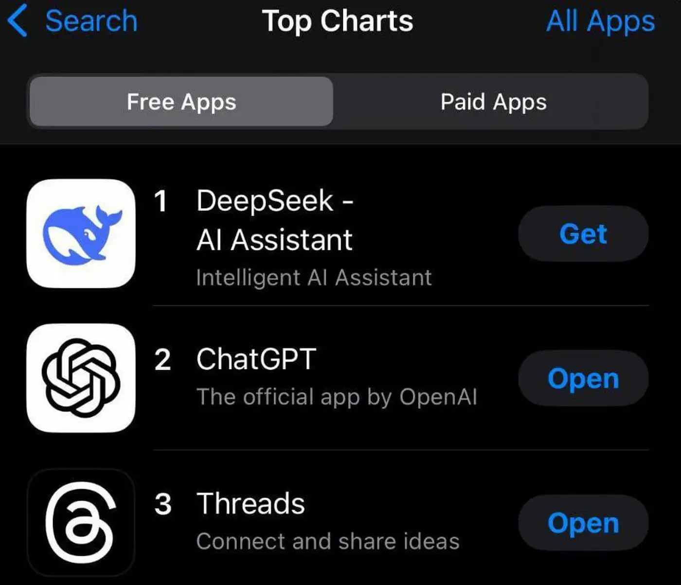 - В американском App Store DeepSeek выбился в топ-1 (хотя ChatGPT ещё держит лидерство, например, в Украине).