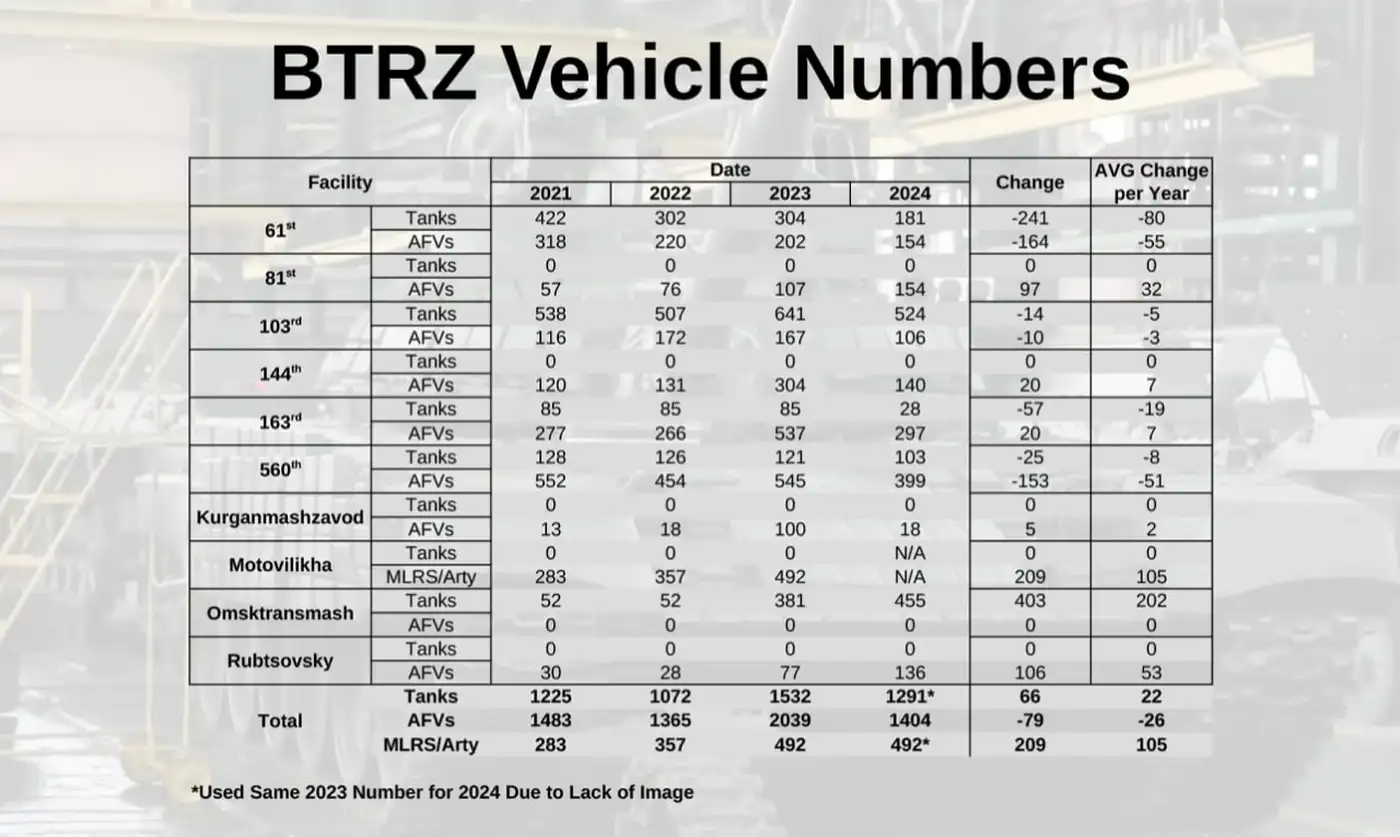 Точный объём выпуска отремонтированной техники можно установить разве что «вживую», если бы кто-то непрерывно вёл учёт каждого поезда, прибывающего и уезжающего с ремонтных баз. Однако, исходя из анализа спутниковых данных и динамики перемещений бронетехники, можно заключить:
