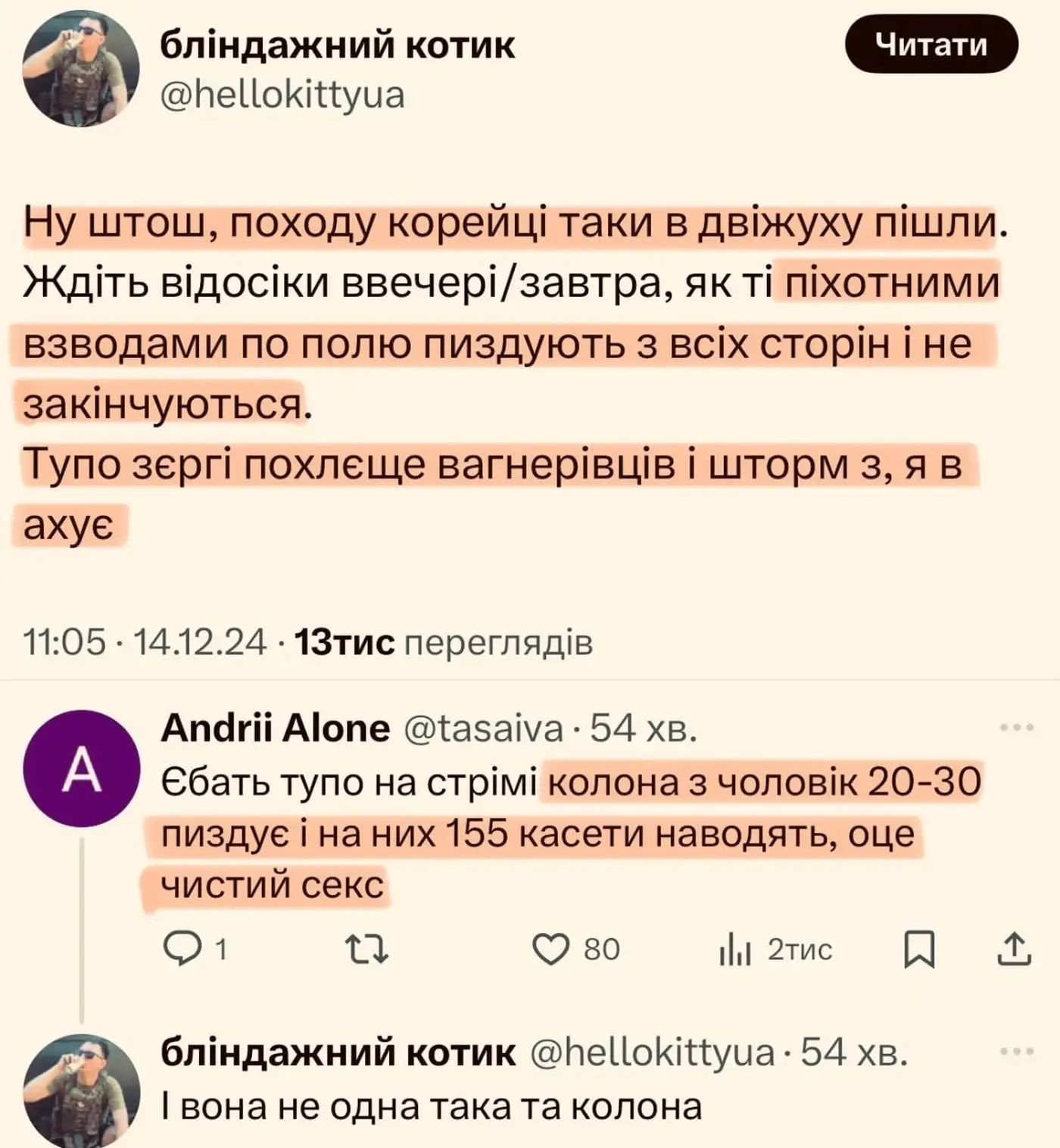 «КНДРовцы шуруют на Курщине в совместных подразделениях с [россиянами]. Уже есть погибшие, тупо бежать по посадкам и равнинам как зомби. Ёбаное мясо.
