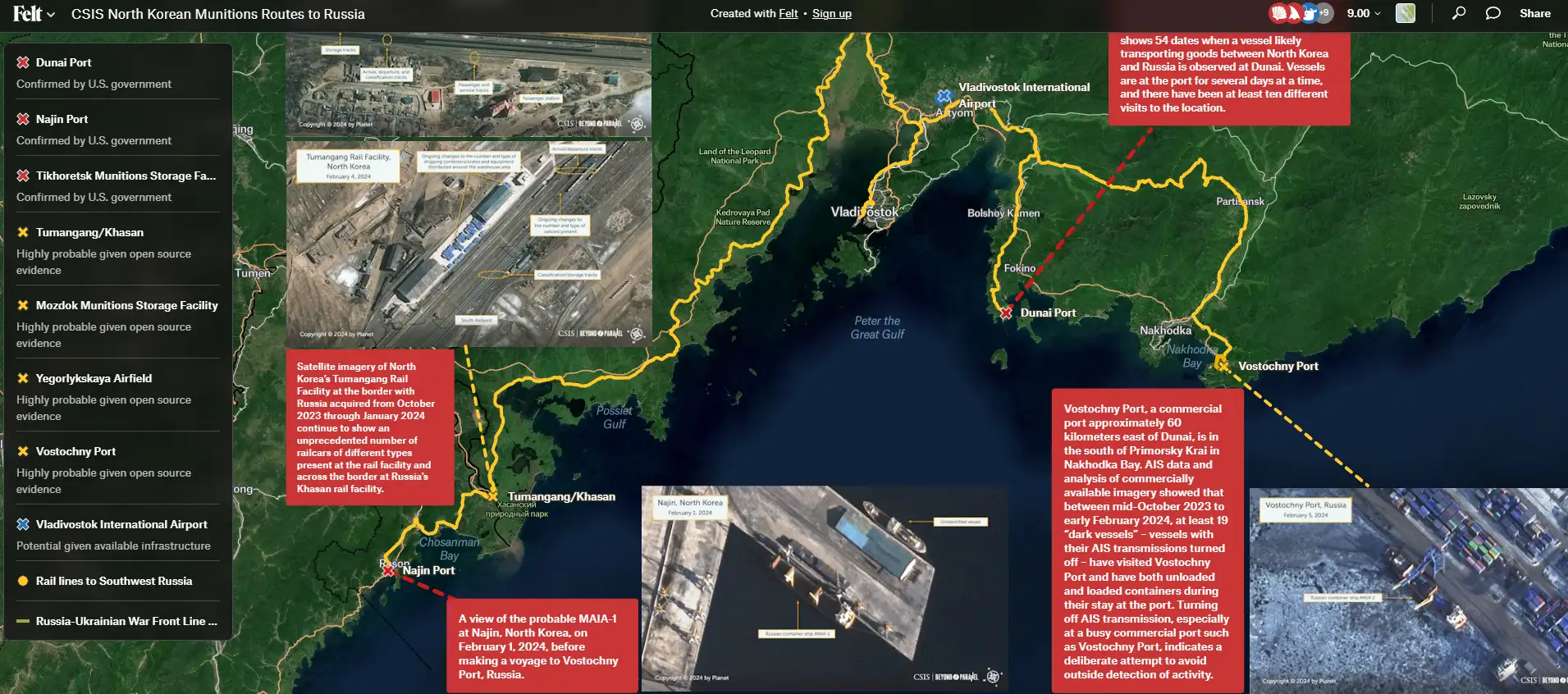 На основании анализа данных, представленных на интерактивной карте и спутниковых изображениях, можно выделить основные логистические узлы, через которые проходит доставка. Начальный пункт поставок находится в порту Наджин в Северной Корее. Этот порт использовался для отправки товаров в Россию, с конечной точкой в Дунайском порту. В Дунайском порту было зафиксировано не менее 54 визитов судов с августа 2023 по февраль 2024 года. Это говорит о систематическом характере поставок.