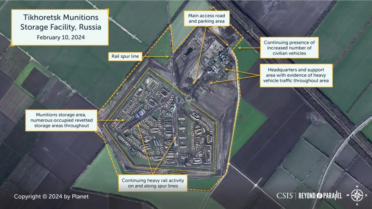 Внутри России основными пунктами распределения боеприпасов стали Тихорецк, Моздок и Егорлыкская. Эти три объекта играют важную роль в распределении боеприпасов по российским вооруженным силам. Тихорецк был подтвержден как склад для северокорейских боеприпасов в октябре 2023 года.