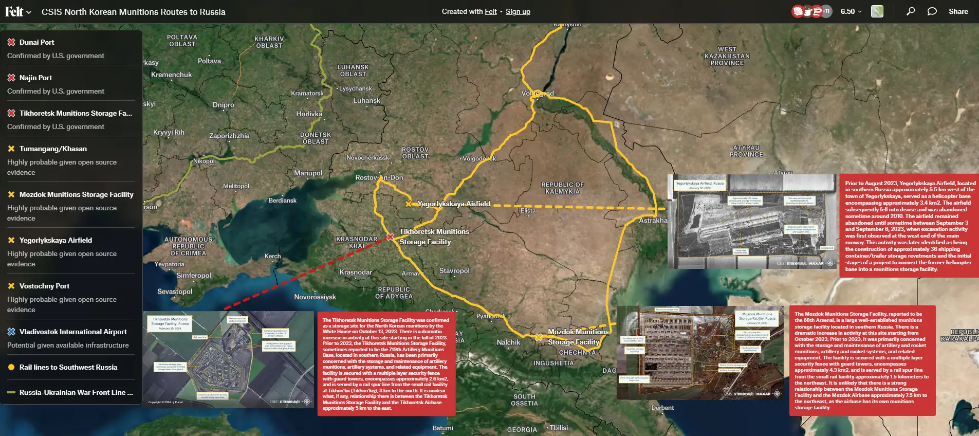 Моздок и Егорлыкская демонстрируют активность, связанную с военными операциями и хранением боеприпасов. Моздок стал важным арсеналом с момента начала поставок в октябре 2023 года, а в Егорлыкской наблюдалось возобновление активности с сентября 2023 года, включая строительство новых складов.