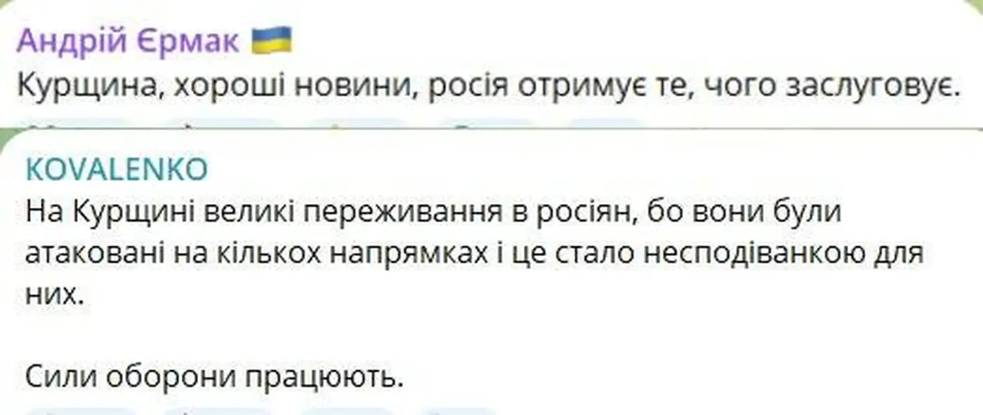 Со стороны Украины пока сохраняется «информационная пауза». Глава Офиса президента Андрей Ермак лишь упомянул, что «Россия получит то, чего заслуживает», а советник СНБО Андрей Коваленко подтвердил факт атаки на нескольких направлениях и отметил, что для россиян это оказалось неожиданным.