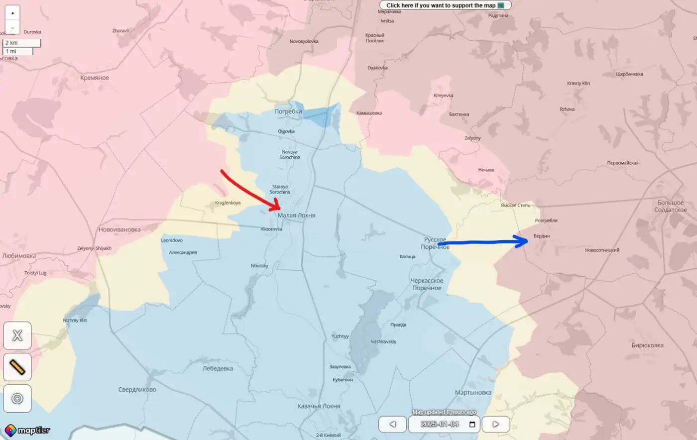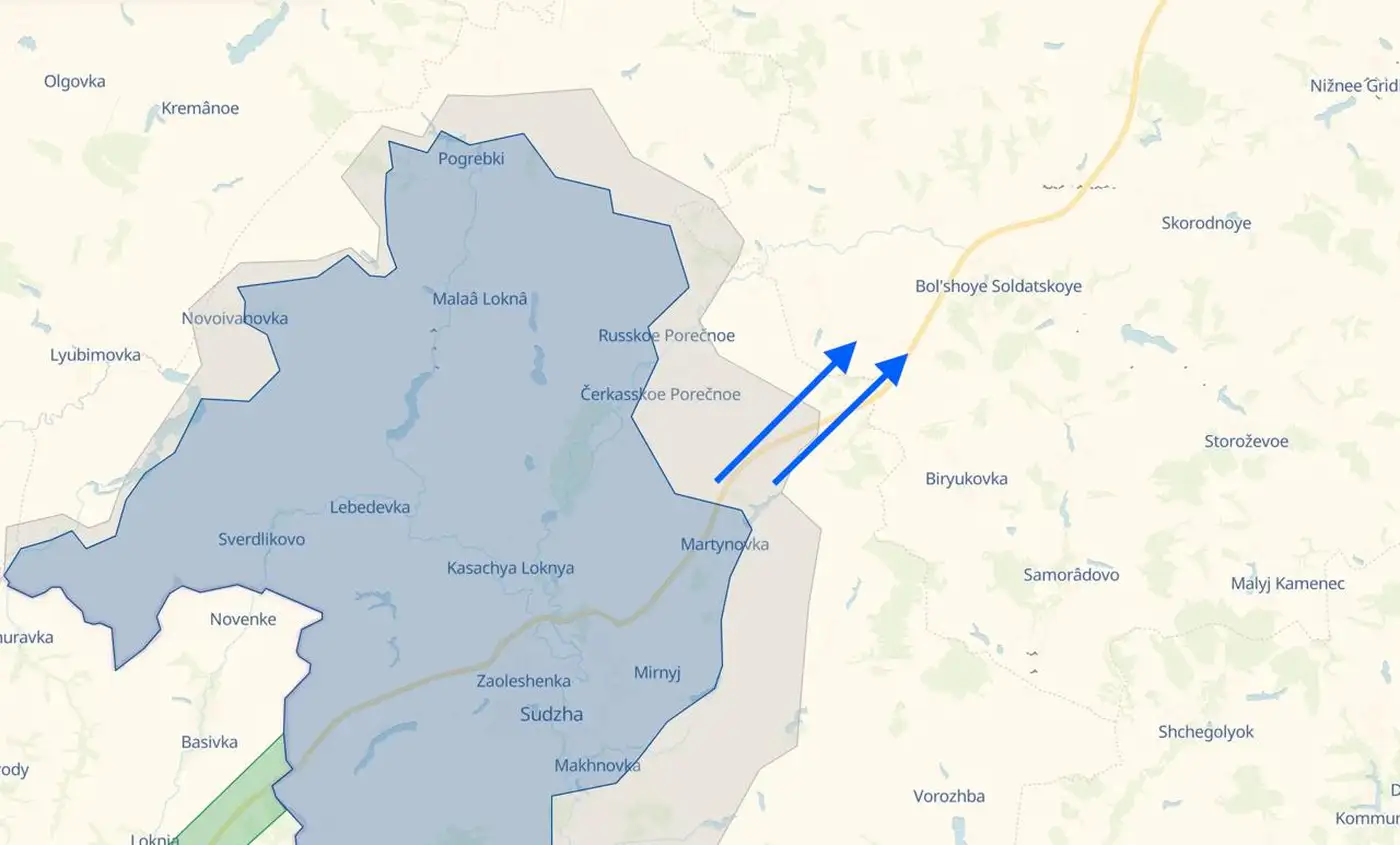 Хутор Бердин. По некоторым сообщениям, в частности от российских источников, ВСУ выдвинулись в направлении хутора Бердин и якобы взяли его под контроль. Официальные подтверждения со стороны Украины отсутствуют.