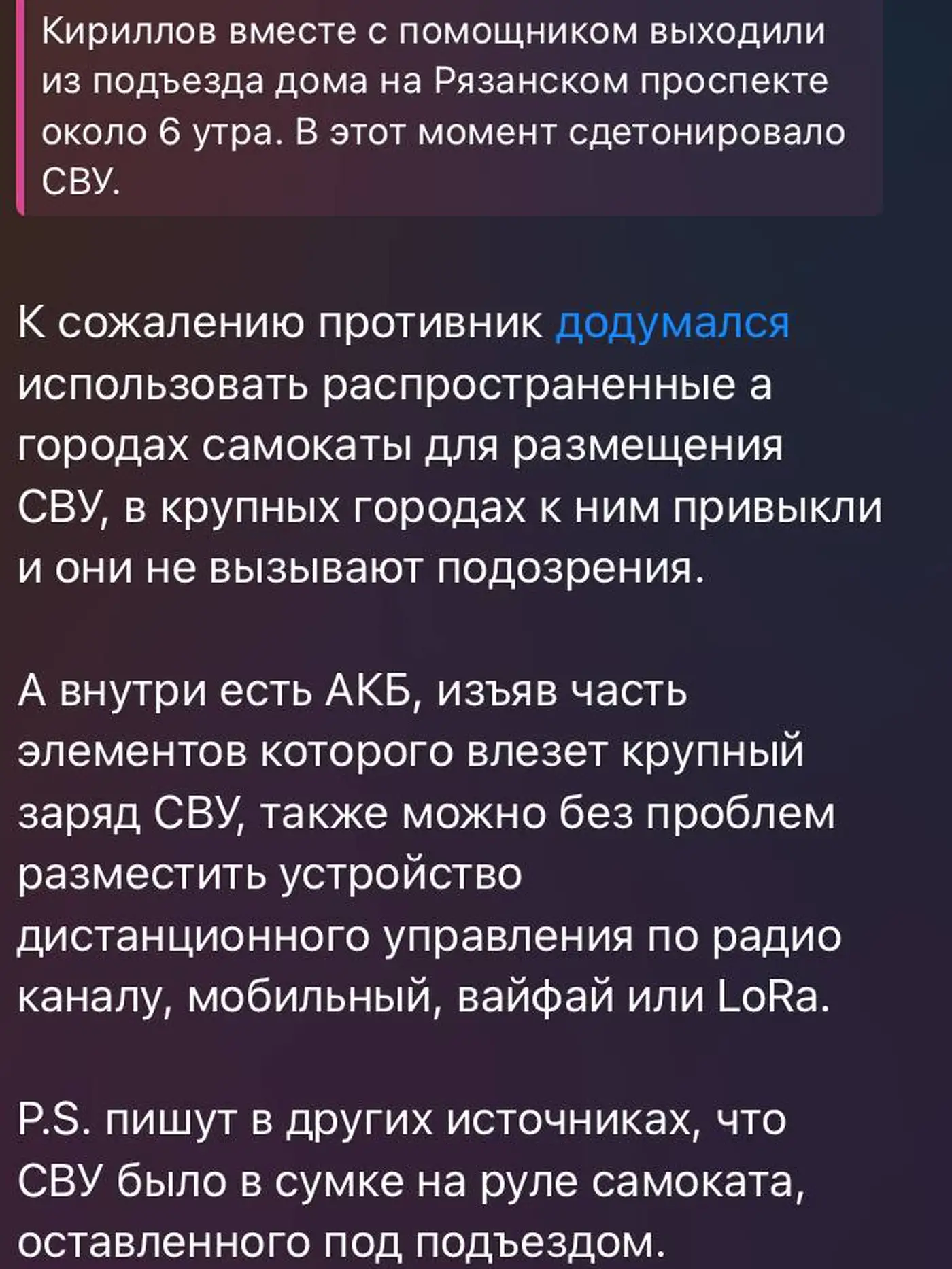В сети уже гуляет видео момента взрыва, и там прекрасно видно, как самокат превращается в огненный тарантул, обрывая и без того сомнительный «боевой» путь генерала кириллова и его ассистента поликарпова. Рядом звучит привычный вой военкоров — они, конечно, возмущены. Возбуждено «дело» по множеству статей, но странно, что следователи не рассматривают нынче модный тренд на самоподрывы среди орков. Хотя было бы логично.
