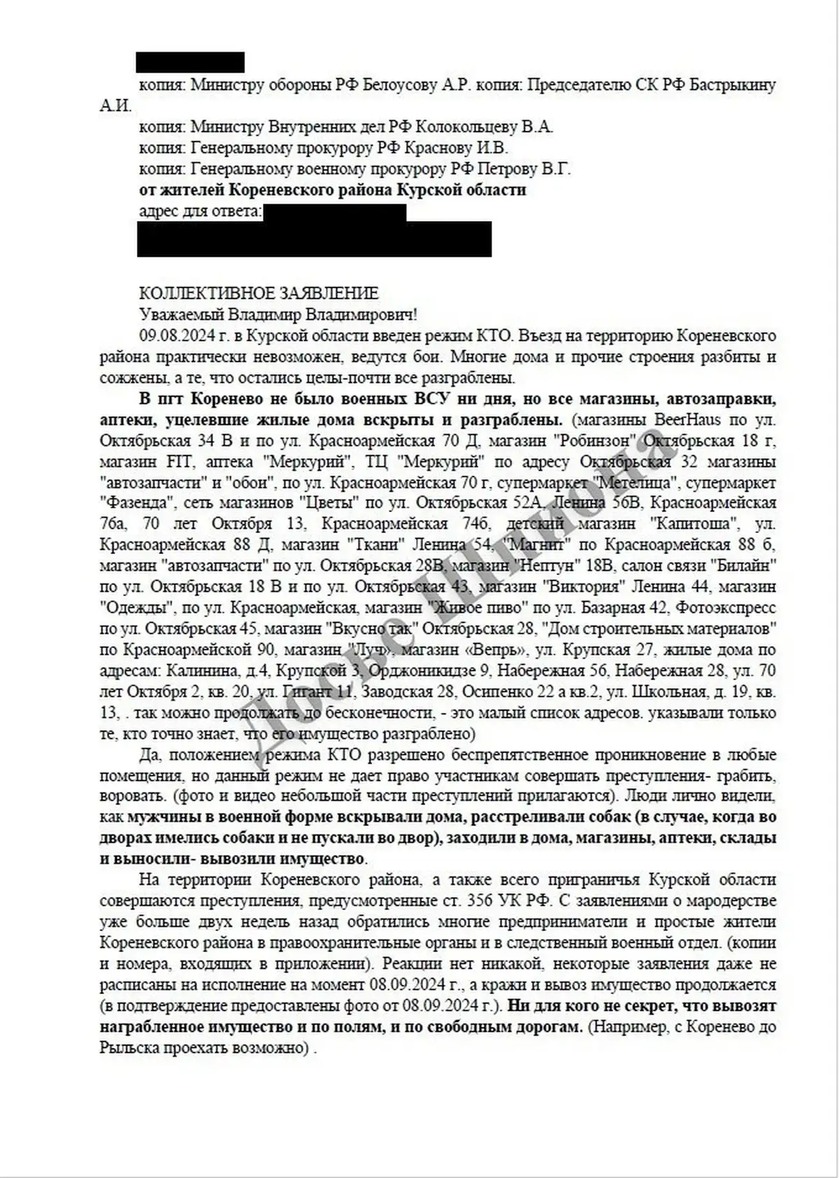 Жители Кореневского района Курской области обратились к российским властям с коллективным заявлением, в котором заявляют о массовом мародёрстве и преступлениях, совершаемых военнослужащими российских вооружённых сил. Несмотря на введённый режим контртеррористической операции (КТО) в районе, где ВСУ активно контратакуют российские войска, сами украинские солдаты в Коренево ещё не заходили. Однако местные жители подвергаются разграблению и насилию со стороны своих же военных.