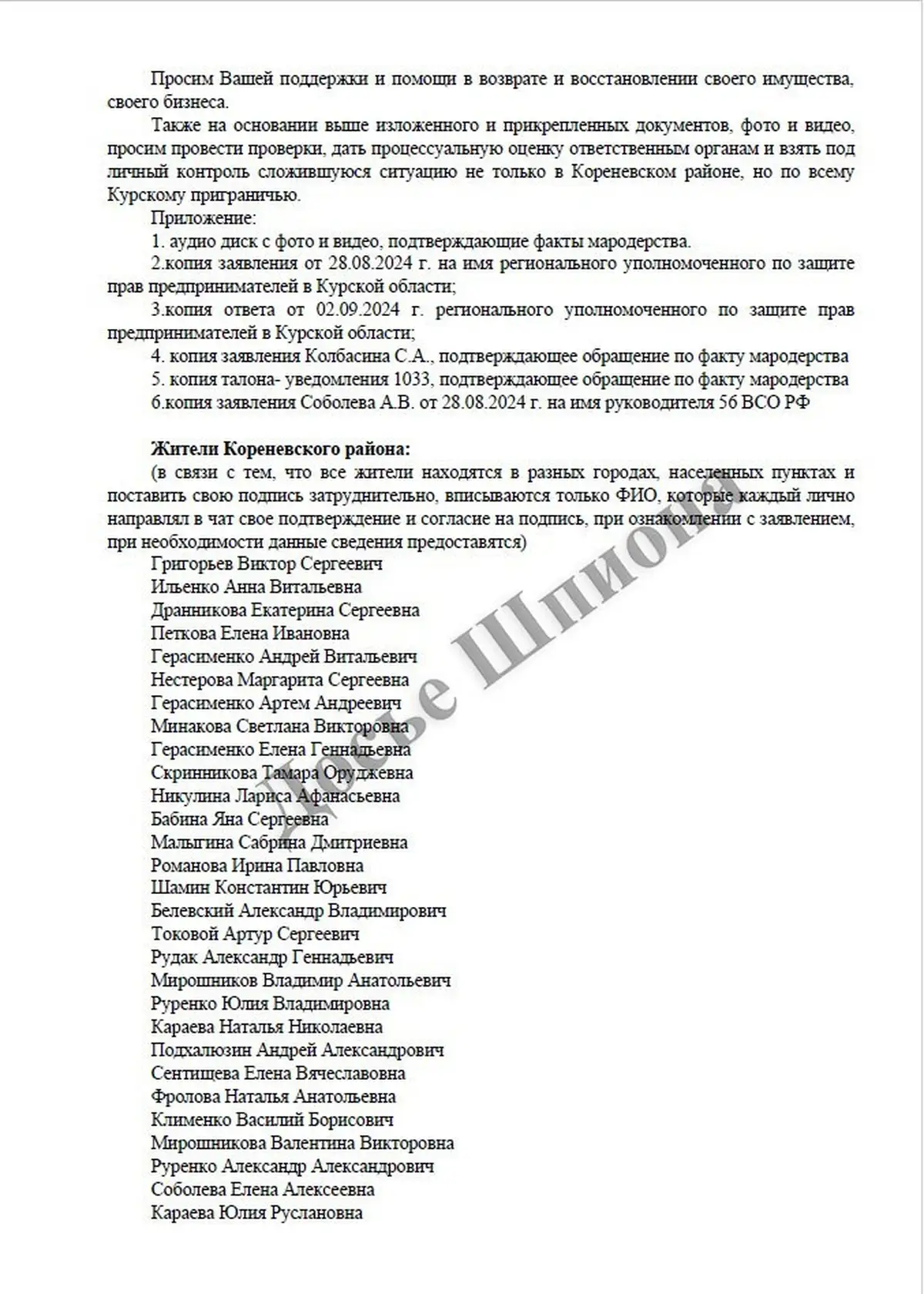 С первых строк заявления видно отчаяние граждан: «В пгт Коренево не было военных ВСУ ни дня, но все магазины, автозаправки, аптеки, уцелевшие жилые дома вскрыты и разграблены». Жители рассказывают о том, как солдаты в военной форме вскрывали дома, грабили их и даже стреляли в собак, охранявших дворы. Они отмечают, что на протяжении недель не было никакой реакции со стороны военной полиции, несмотря на неоднократные обращения.