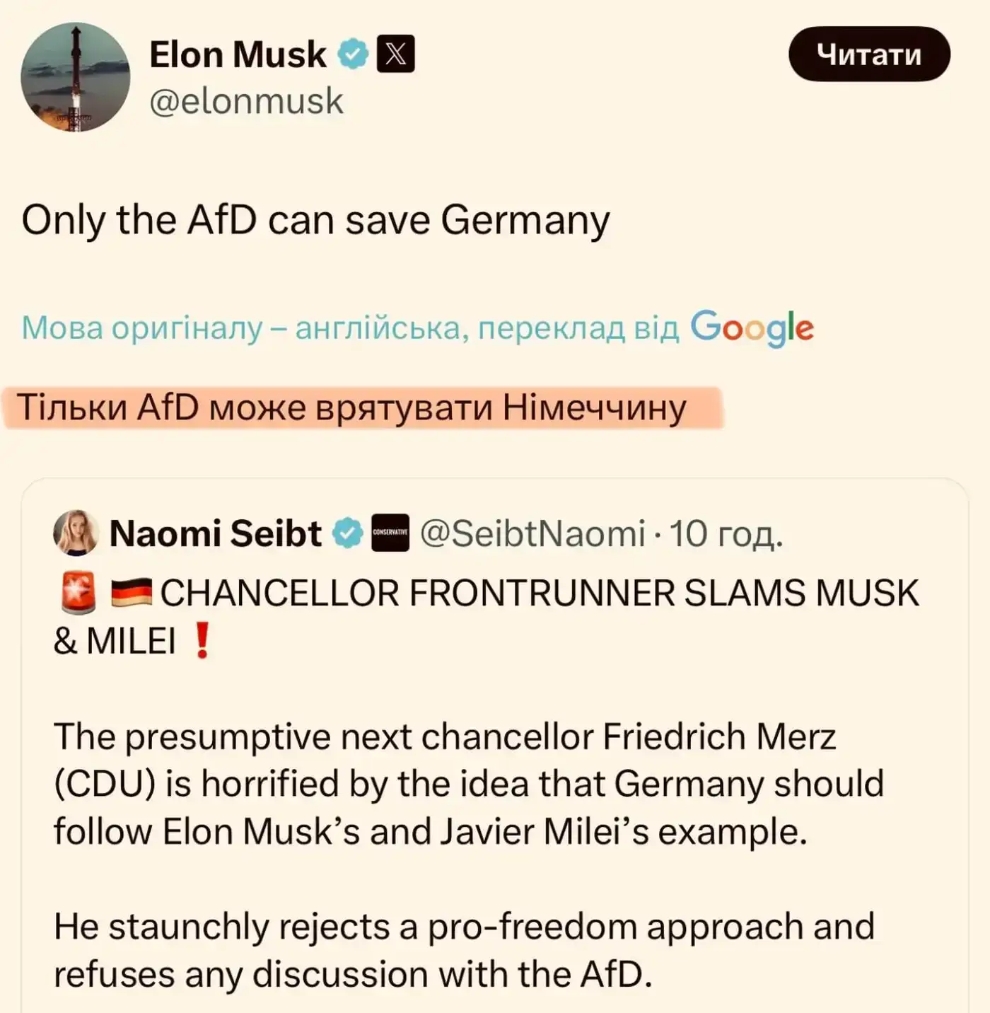 Ранее Маск поддержал партию «Альтернатива для Германии», заявив, что только она может Германию спасти.