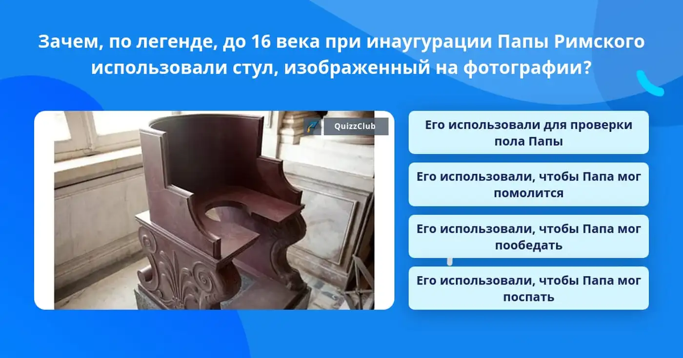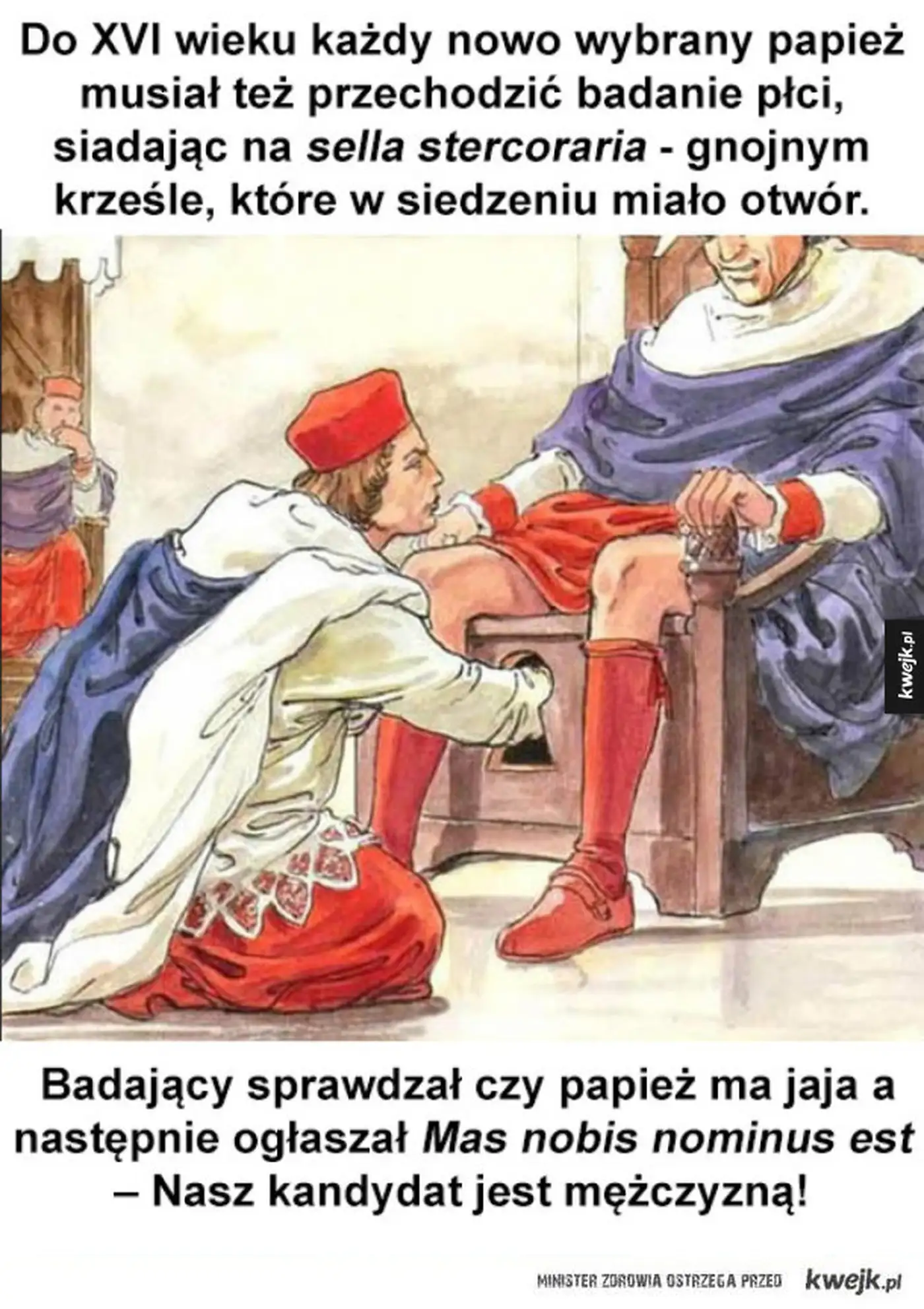 Чтобы не допустить повторения конфуза «папессы Иоанны», римские понтифики, сняв штаны усаживались на sella stercoraria, а все желающие могли увидеть и пощупать гениталии нового папы и убедиться в том, что «всё на месте».
