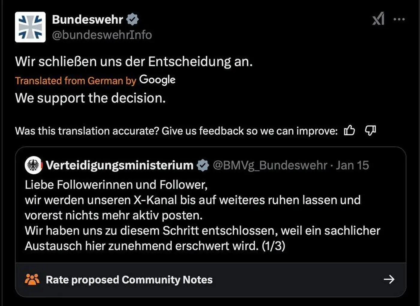 Министерство обороны Германии и Бундесвер (армия Германии) приостановили обновление своих аккаунтов в социальной сети X. Они объяснили это тем, что «объективный обмен аргументами становится всё более трудным».