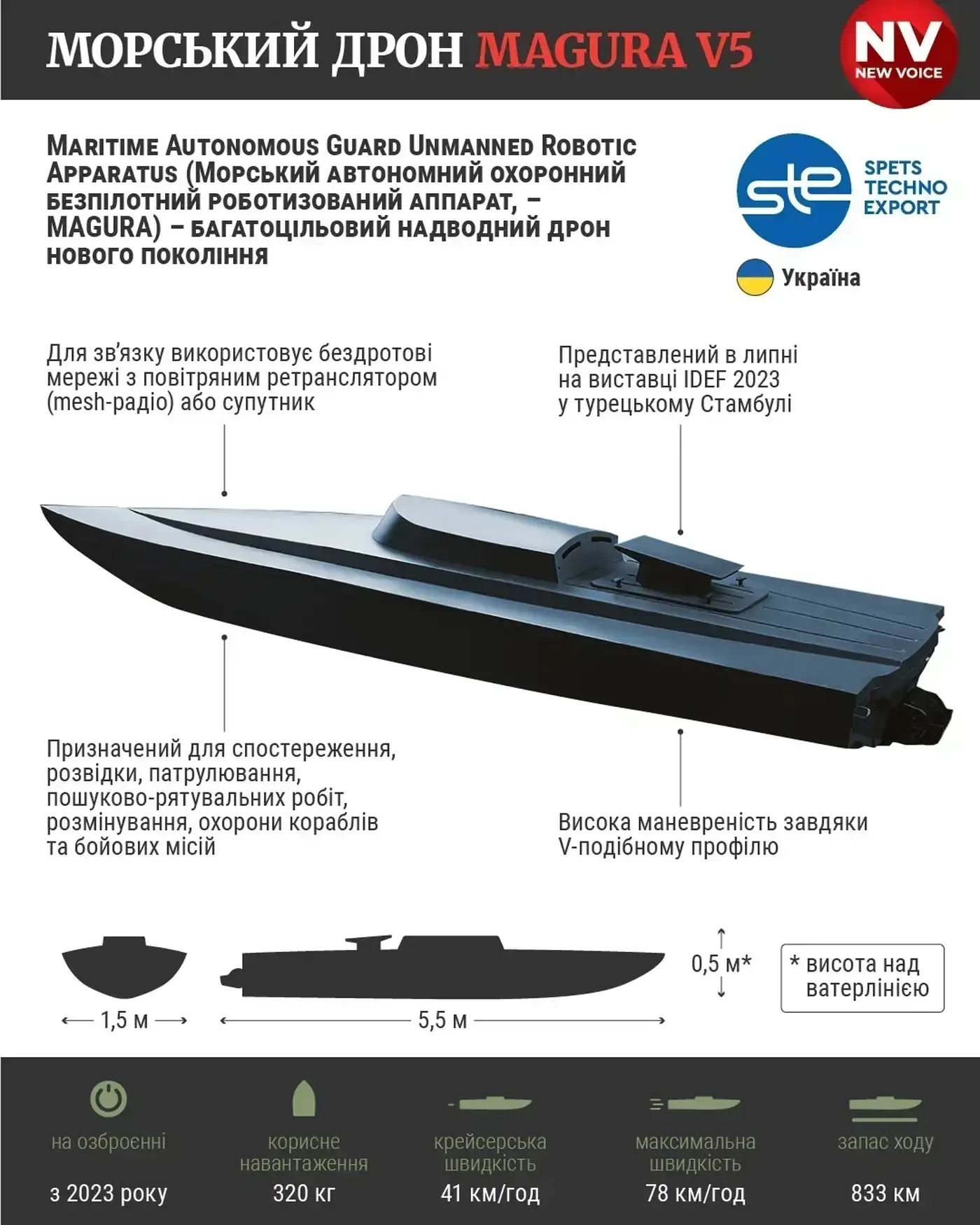 Эта крошечная лодка длиной всего около 5,5 метра стала причиной гибели нескольких российских кораблей, в том числе ракетного корвета Ивановец (31 января 2024 года) и большого десантного корабля Цезарь Куников (14 февраля 2024 года). Однако V5 появился лишь в 2023 году. До него было, как видно из индекса, ещё четыре версии.