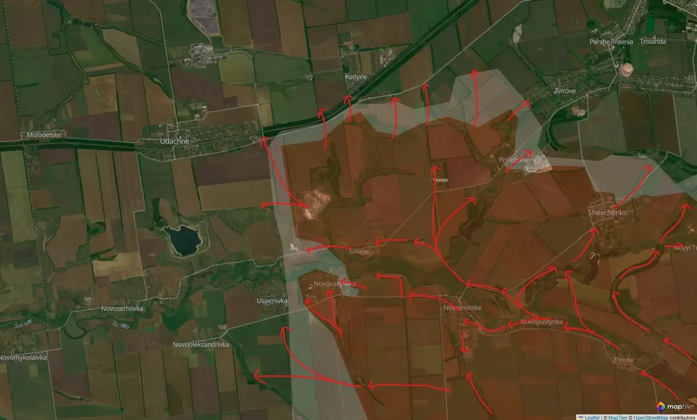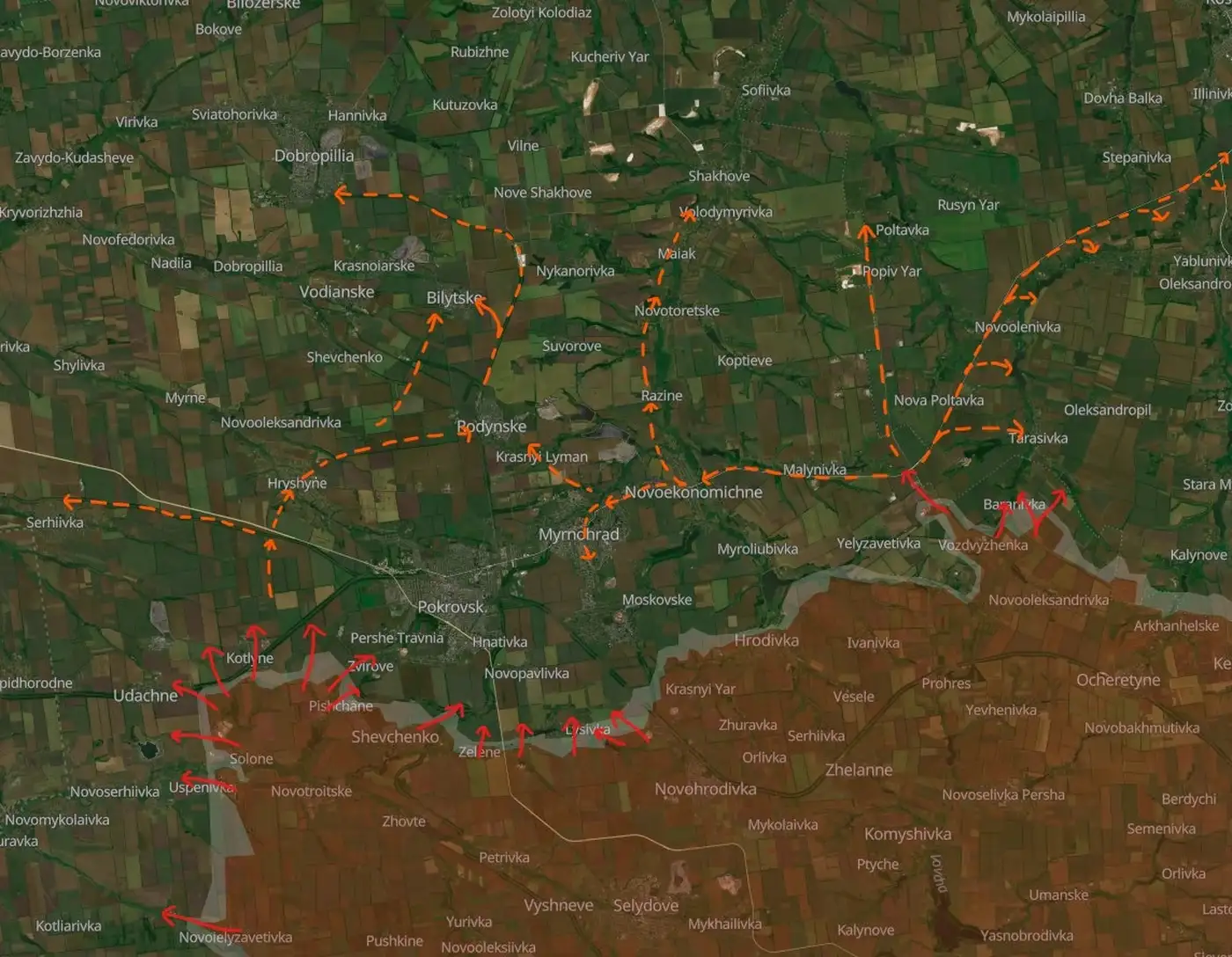 К югу от Покровска российские подразделения пытаются преодолеть системы траншей, защищающие города-спутники. Опасными участками считаются Звировое, Даченское и Чунышино.
