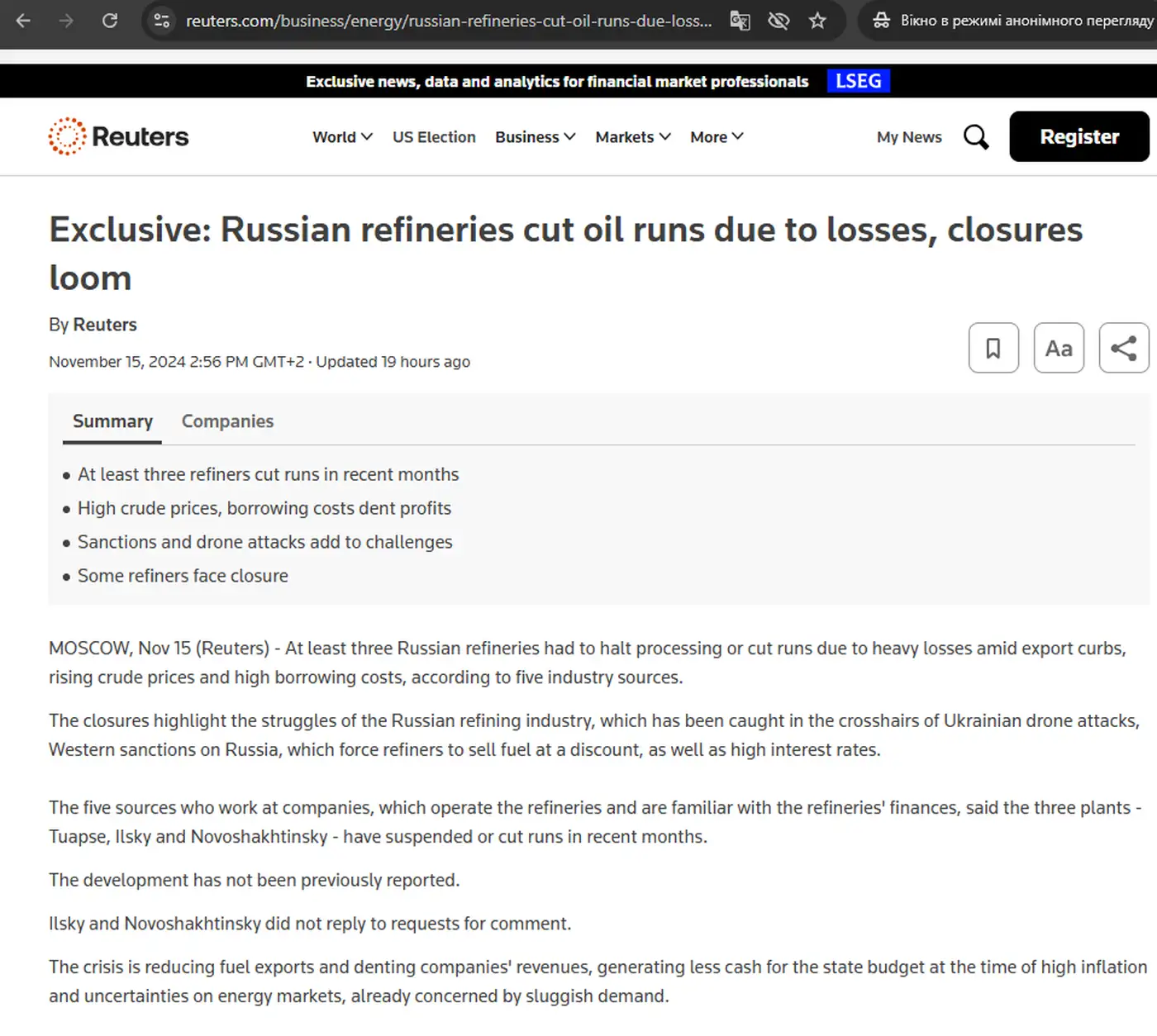 ❗️Reuters: три российских НПЗ сократили переработку и находятся на грани закрытия. Это Туапсинский, Ильский и Новошахтинский НПЗ.