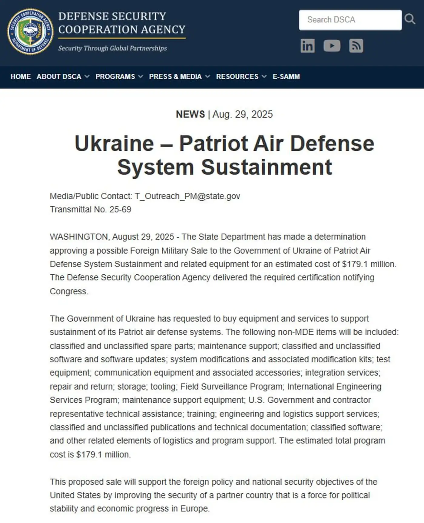 Более крупная из двух сделок, оцениваемая в 179,1 млн долларов США, предназначена для поддержания украинских систем ПВО Patriot.