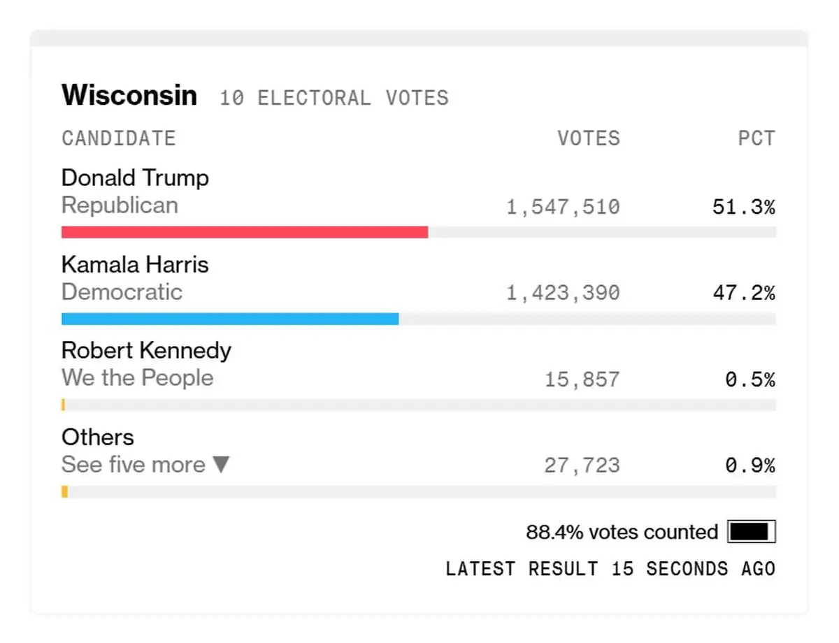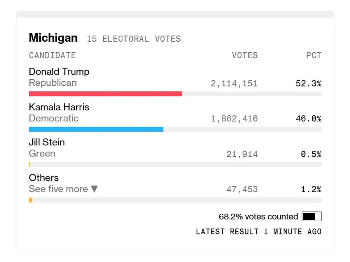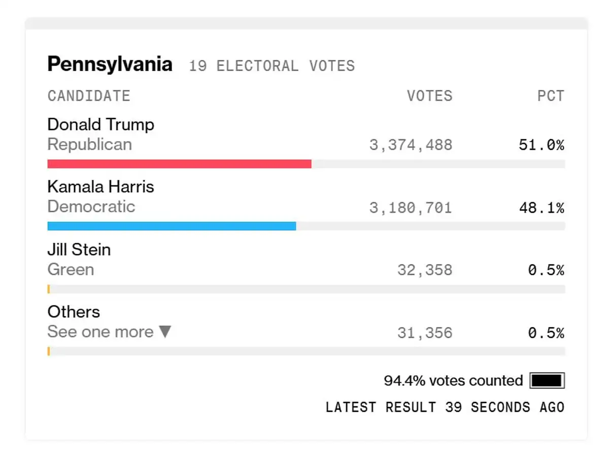 Трамп побеждает во всех 3 из 3 ключевых штатах, которые были необходимы для победы Харрис — Пенсильвании, Мичигане и Висконсине. Чуда не случилось.