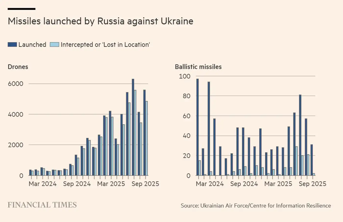 На изображении ниже графики Financial Times, подготовленные на основе данных Воздушных сил Украины и Центра устойчивости к информации.