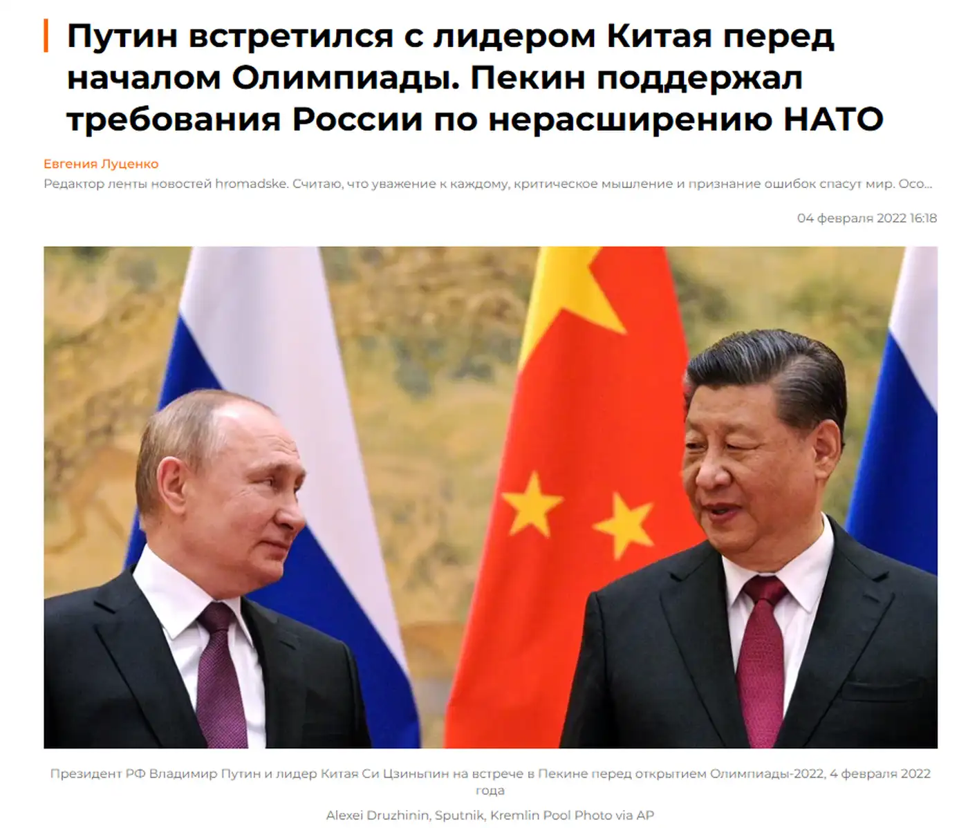 Следующий ключевой момент — Олимпиада в Пекине в феврале 2022 года. 4 февраля Путин и Си снова встречаются, а уже 24 февраля начинается полномасштабное вторжение России в Украину. День, который изменил ход истории и превратил войну на Донбассе в крупнейший военный конфликт в Европе со времён Второй мировой.