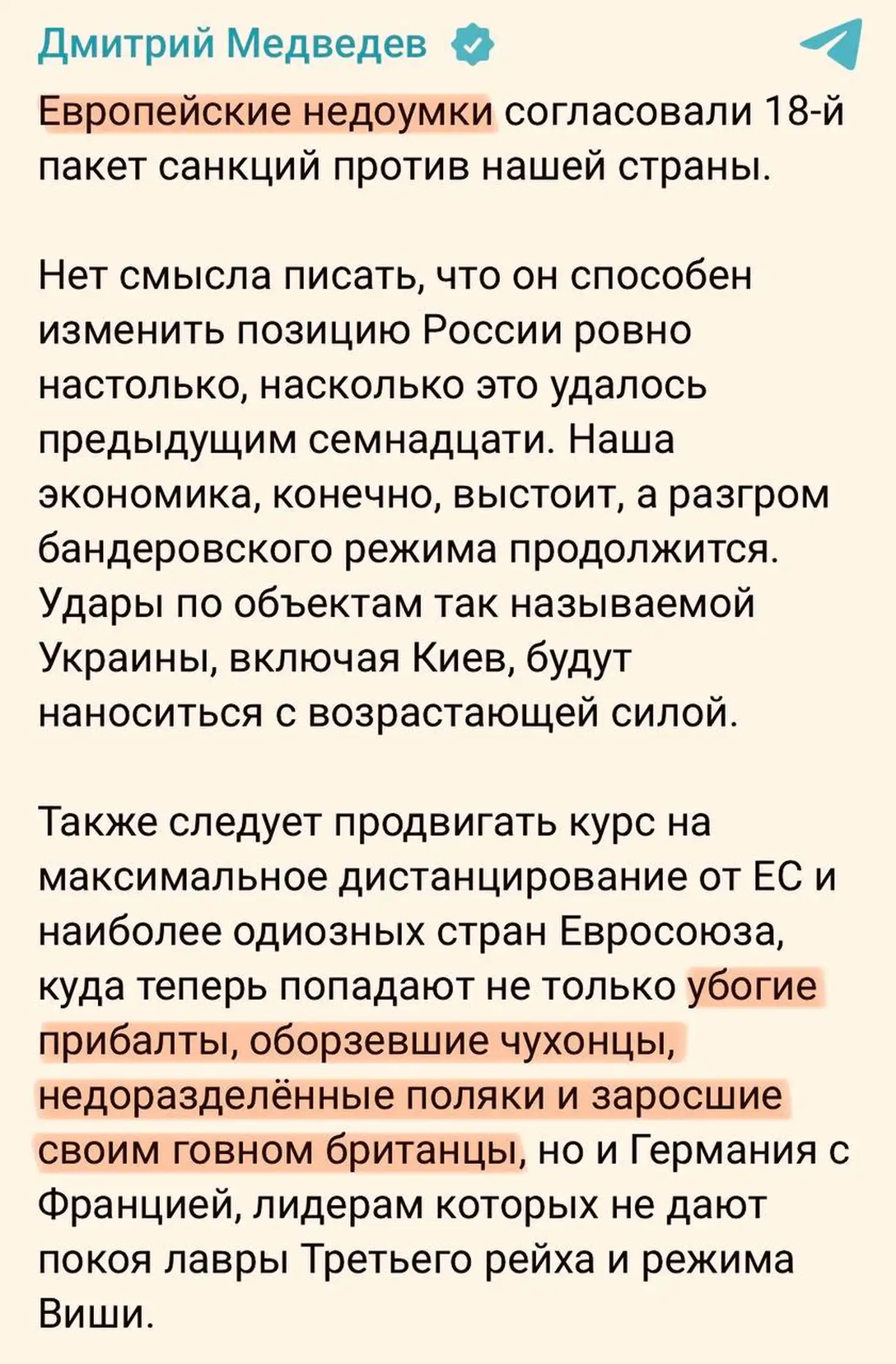 «Европейские недоумки согласовали 18-й пакет санкций против нашей страны.