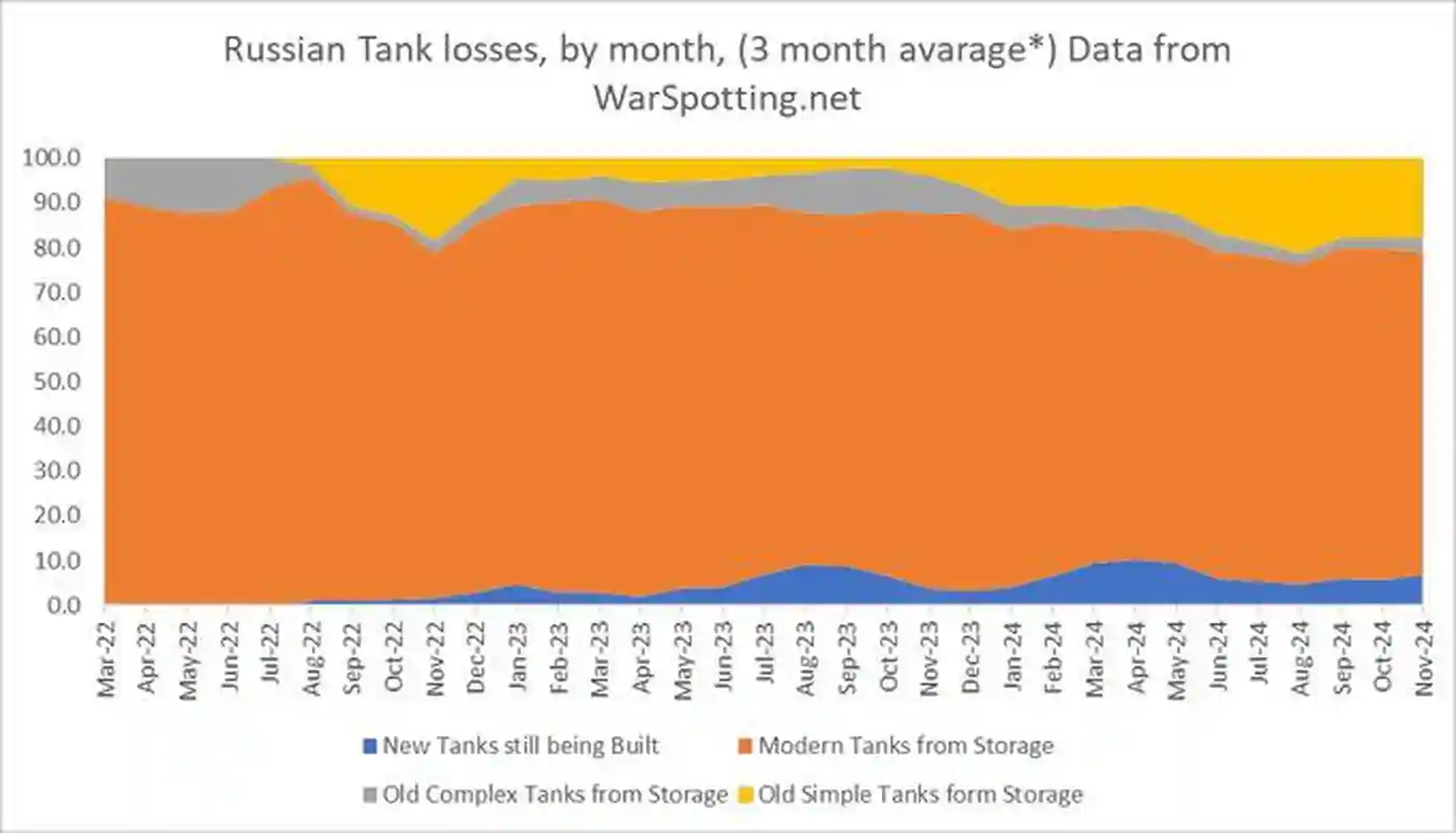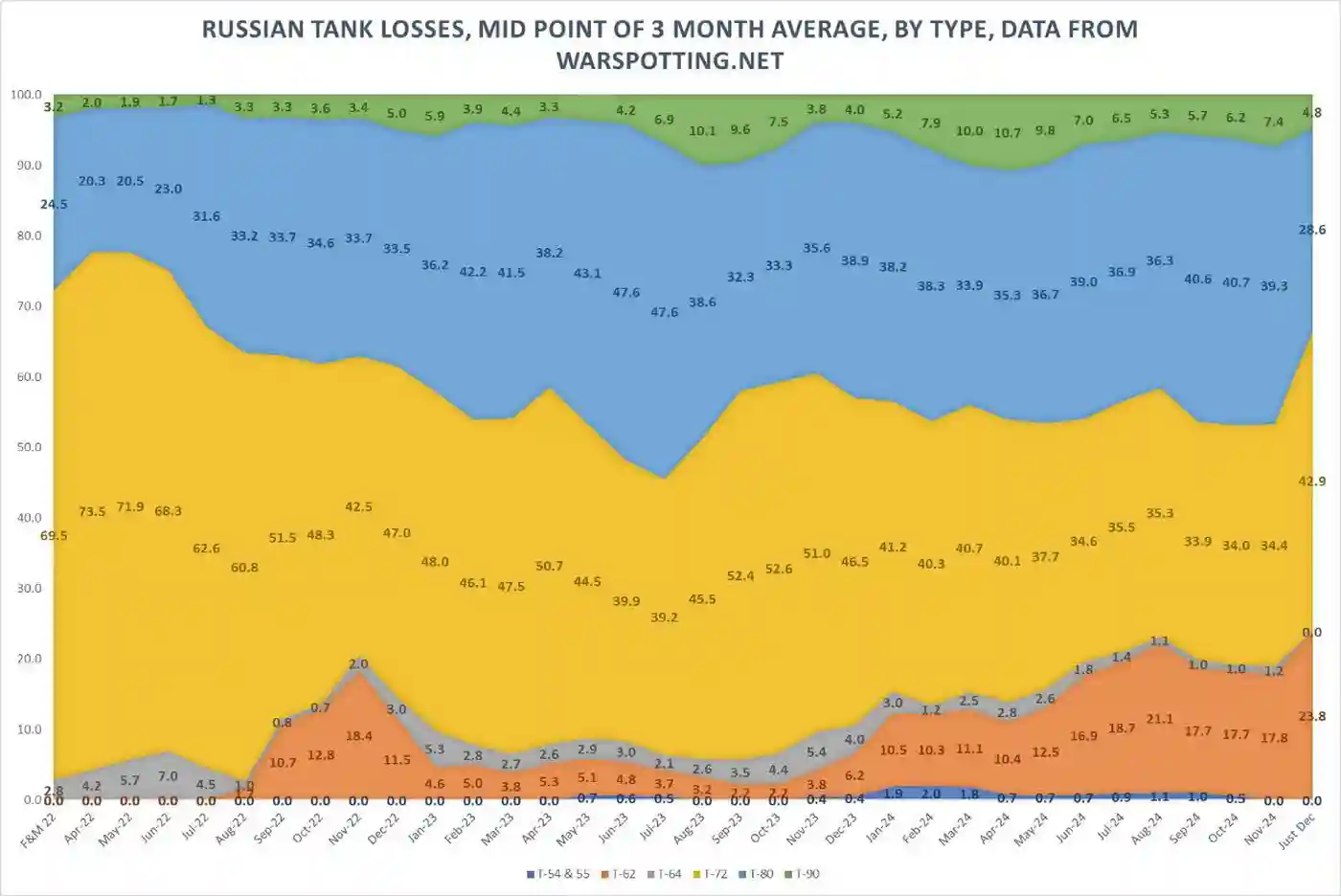 Этот график иллюстрирует динамику потерь различных типов танков РФ в ходе конфликта. Он демонстрирует увеличение доли устаревших моделей, таких как Т-54/55 и Т-62, и сокращение потерь современных танков.