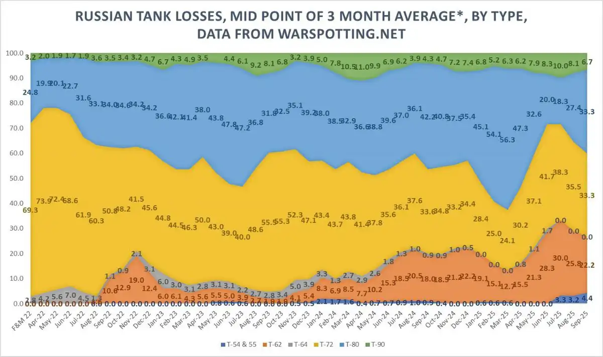 В частности, Т-72 и Т-80 — каждый из этих типов занимает примерно по трети от общего числа потерь.