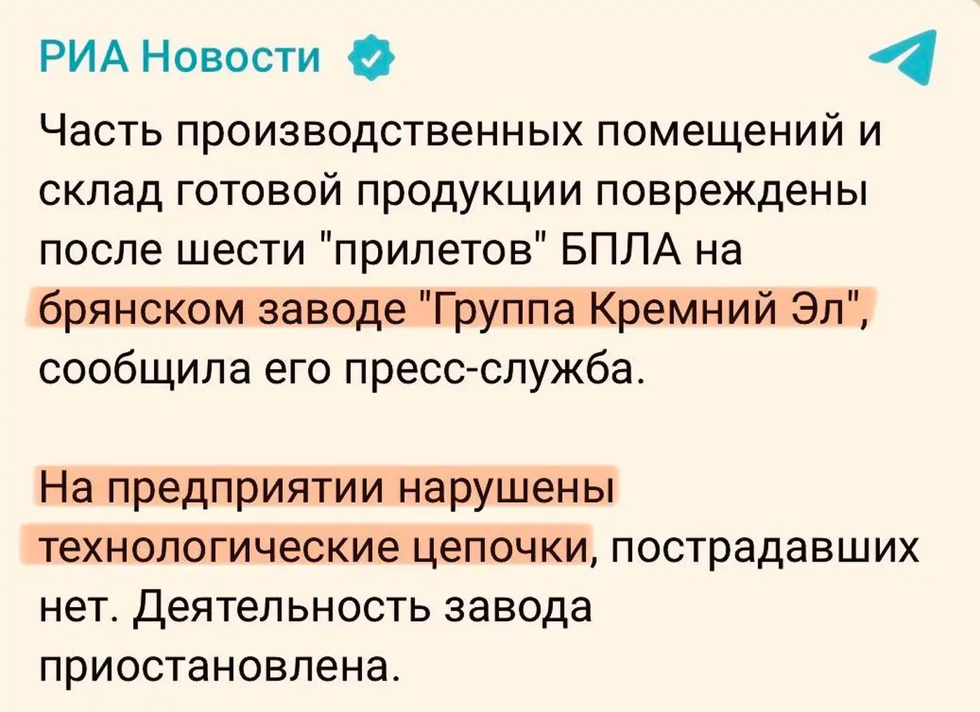 Тем временем, Брянский завод «Кремний Эл», один из крупнейших производителей микроэлектроники в России, вновь оказался под ударом украинских БПЛА. Это уже четвертая атака на предприятие, которая нанесла значительный ущерб производственным мощностям. Пресс-служба завода сообщает о нарушении технологических цепочек и приостановке деятельности предприятия.