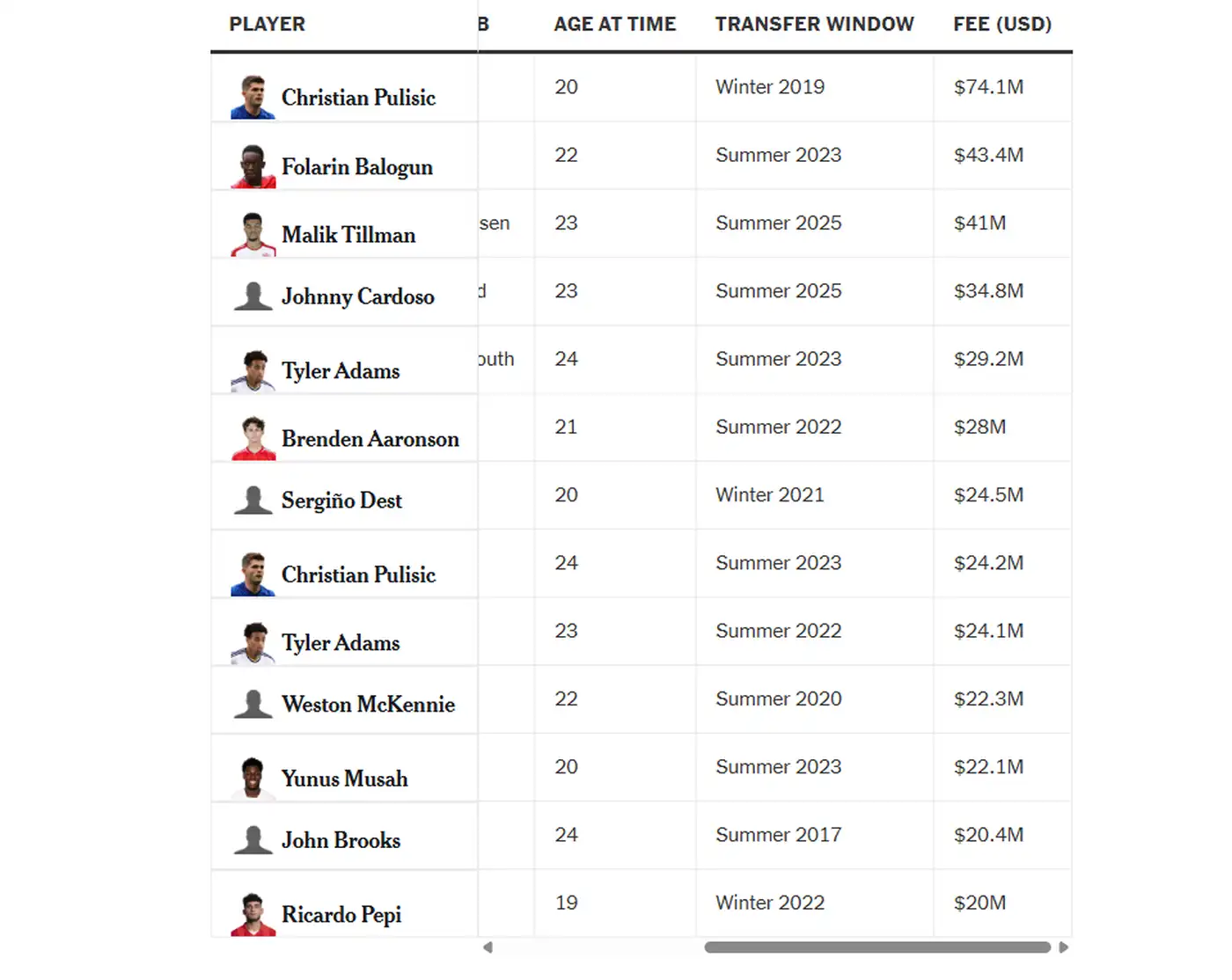 И вот мы снова возвращаемся к Джонни, Тиллману и последним крупным суммам за американцев в Европе. Все дюжина с лишним самых дорогих трансферов игроков сборной США случились за последние десять лет и касались футболистов младше 25 лет. Лидером остаётся переход Кристиана Пулишича из «Боруссии Дортмунд» в «Челси» за 74,1 миллиона долларов в январе 2019 года. Все эти суммы были напрямую подтверждены The Athletic, за исключением трансфера Джона Брукса, данные о котором опубликованы на официальном сайте U.S. Soccer.