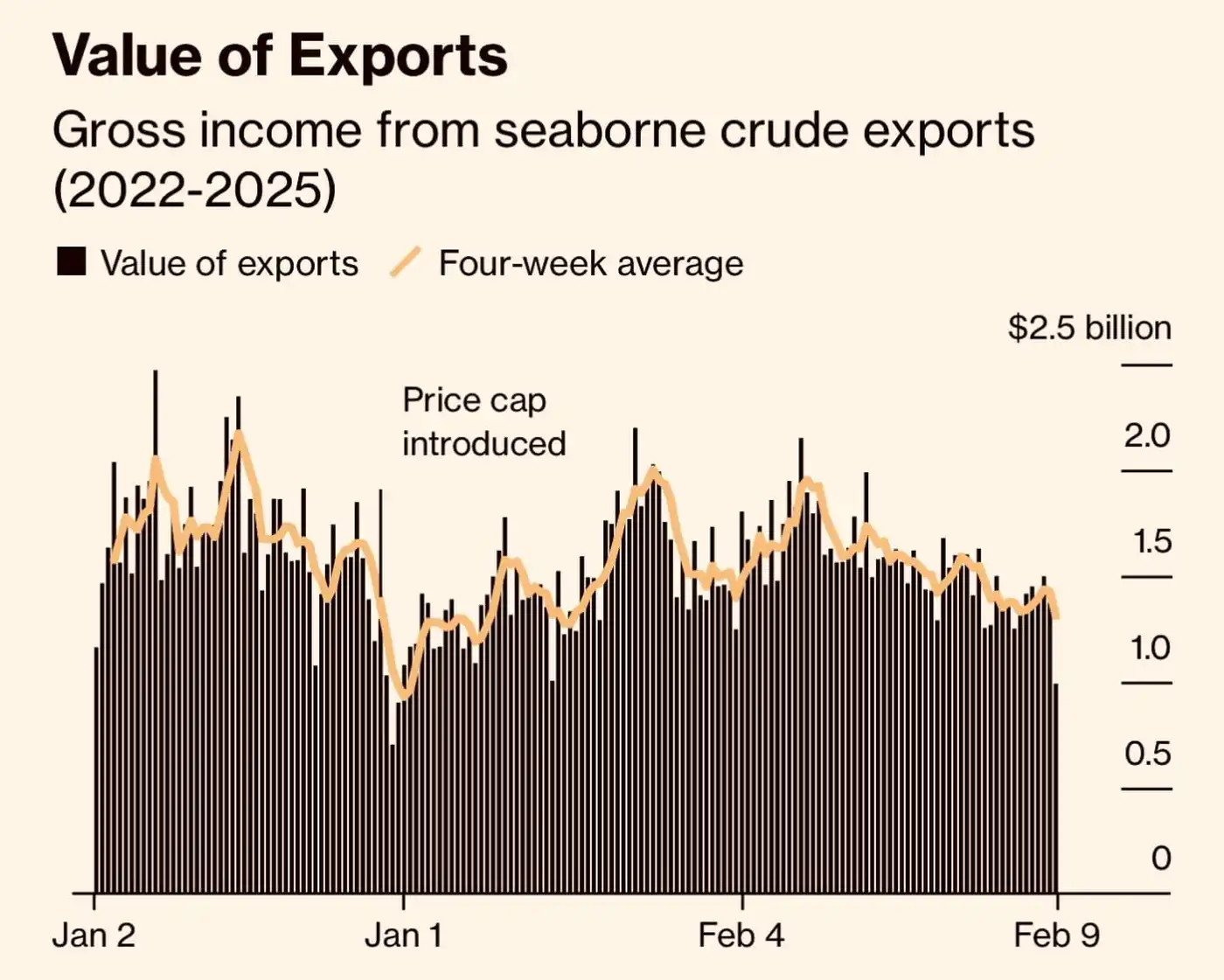 Bloomberg : На прошлой неделе морской экспорт российской нефти упал с 3 до 2.3 млн б/с.