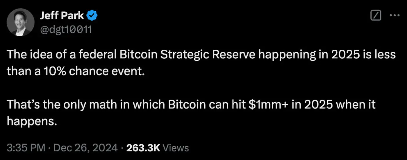 Главный инвестиционный директор Bitwise Джефф Парк заявил, что в случае создания США стратегического резерва биткоина его стоимость может превысить $1 млн. Однако вероятность такого сценария в ближайшее время составляет менее 10%.