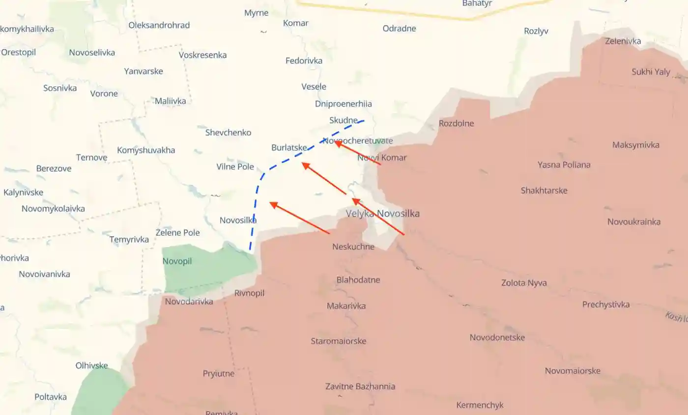 Заняв Времьевку и продвинувшись на юг от села Новый Комар, российские войска вплотную подошли к окраинам Великой Новоселки с трех сторон. Сегодня сообщали о начавшемся штурме. Все четыре дороги, ведущие в поселок, под контролем России. У ВСУ остается лишь одна возможность выйти — отступить на северо-запад и переправиться через реку Мокрые Ялы, которая в этом месте довольно широкая.