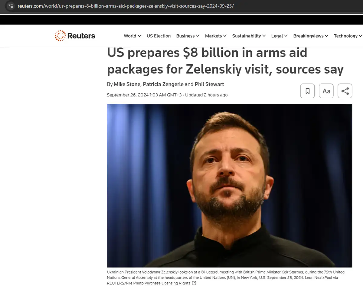 25 сентября агентство Reuters сообщило, что Соединенные Штаты планируют объявить о предоставлении Украине более $8 миллиардов военной помощи в ходе визита президента Владимира Зеленского в Вашингтон. По словам двух американских официальных лиц, эта помощь станет ключевым шагом в поддержке украинской армии на фоне продолжающегося конфликта с Россией.